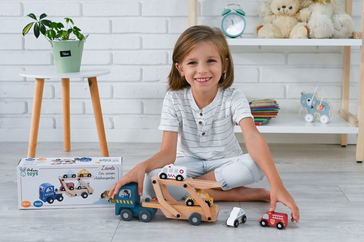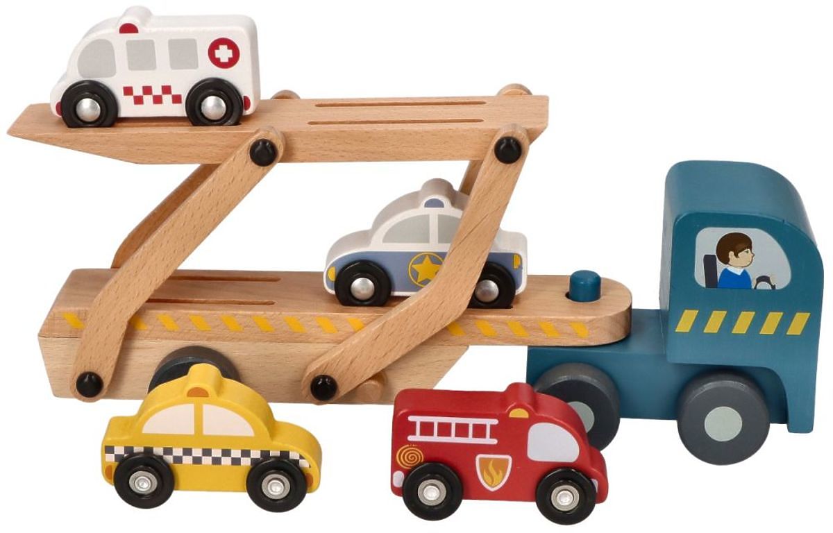 Prevoznik je sestavljen iz dveh zložljivih nivojev. Zgornjo ploščo je mogoče spustiti in ustvariti rampo, po kateri bodo avtomobili zapeljali. Set vključuje tudi štiri lesene, raznobarvne avtomobile. Prevoznik je nameščen na zatiču, kar omogoča, da je zadnji del gibljiv in zavija. Prevoznika je mogoče tudi odklopiti in se odpeljati samo s tovornjakom - vlačilcem. To vozilo ponuja veliko možnosti za zabavo.