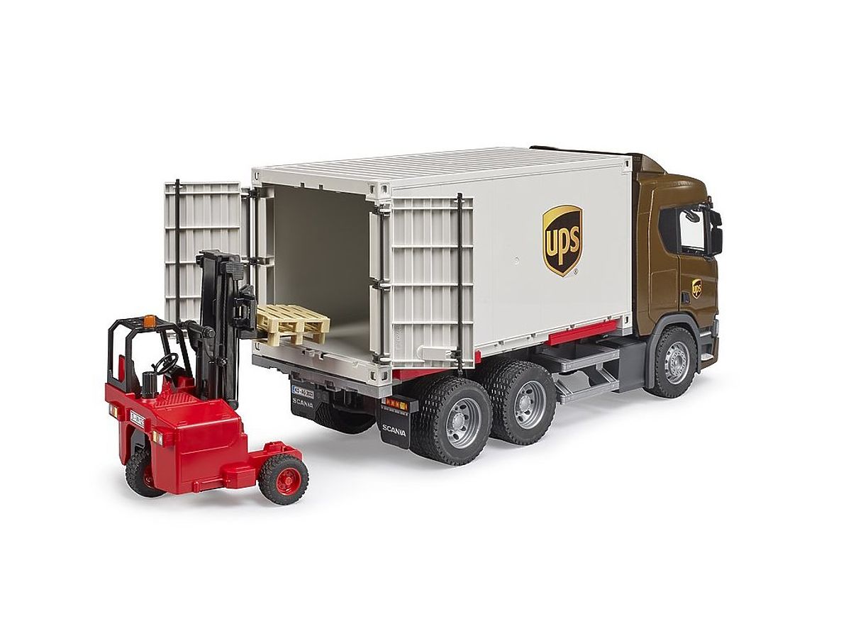 Scania serije R ima tri osi, vrata, ki se odpirajo, in zložljiva ogledala. Paket vključuje odstranljiv kontejner, dve paleti in popolnoma funkcionalen viličar. Enostavno razstavljiv kontejner je opremljen z zadnjimi dvižnimi vrati. Manipulacijo pri nakladanju in razkladanju olajšajo podporne noge, ki omogočajo, da se kontejner brez težav loči od vozila. Z izvlekom in podaljšanjem podpor se kontejner dvigne in tovornjak se lahko oddalji od kontejnerja. Za več zabave pri igri lahko vozilu dodate svetlobni in zvočni modul (koda BR2801). Glavne značilnosti: vrata, ki se odpirajo, zložljiva ogledala, podporne noge, odstranljiv kontejner, zadnja dvižna vrata kontejnerja, profilne pnevmatike, izdelano v Nemčiji, primerno od 2 let