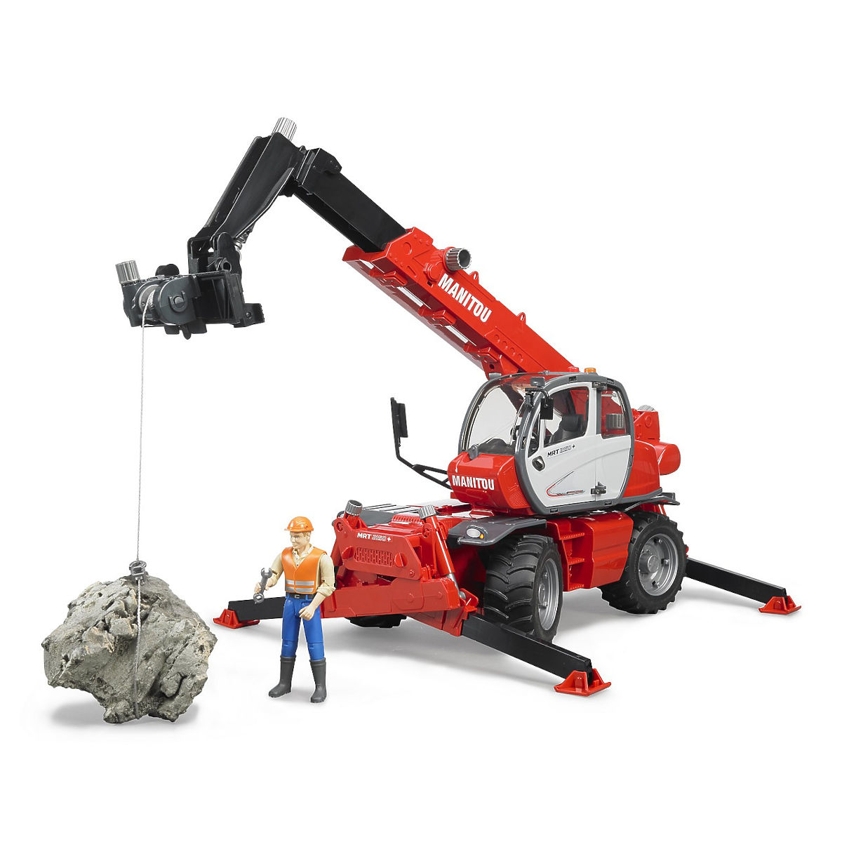 Manitou MRT 2150 teleskopski nakladalnik je vsestranski stroj za uporabo na gradbiščih in v kmetijstvu. Nakladalno žlico zamenjajte z vilicami ali paletno košaro in imate resnično vsestranskega pomočnika. Kabina nakladalnika se vrti za 360°. Tako kot pri originalu stabilnost zagotavljajo štiri teleskopske podpore. Štirikolesno krmiljenje (majhen obračalni polmer) je posebna funkcija tega nakladalnika. Izdelano v Nemčiji iz kakovostnih materialov. Glavne lastnosti: številne funkcije žlica - vilice - paletna košara vrtljiva kabina za 360° posebna funkcija - štirikolesno krmiljenje izdelano v Nemčiji Nagrada za igračo: Top 10 Spielzeug 2013