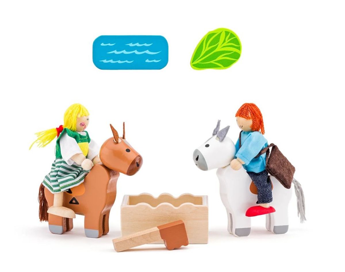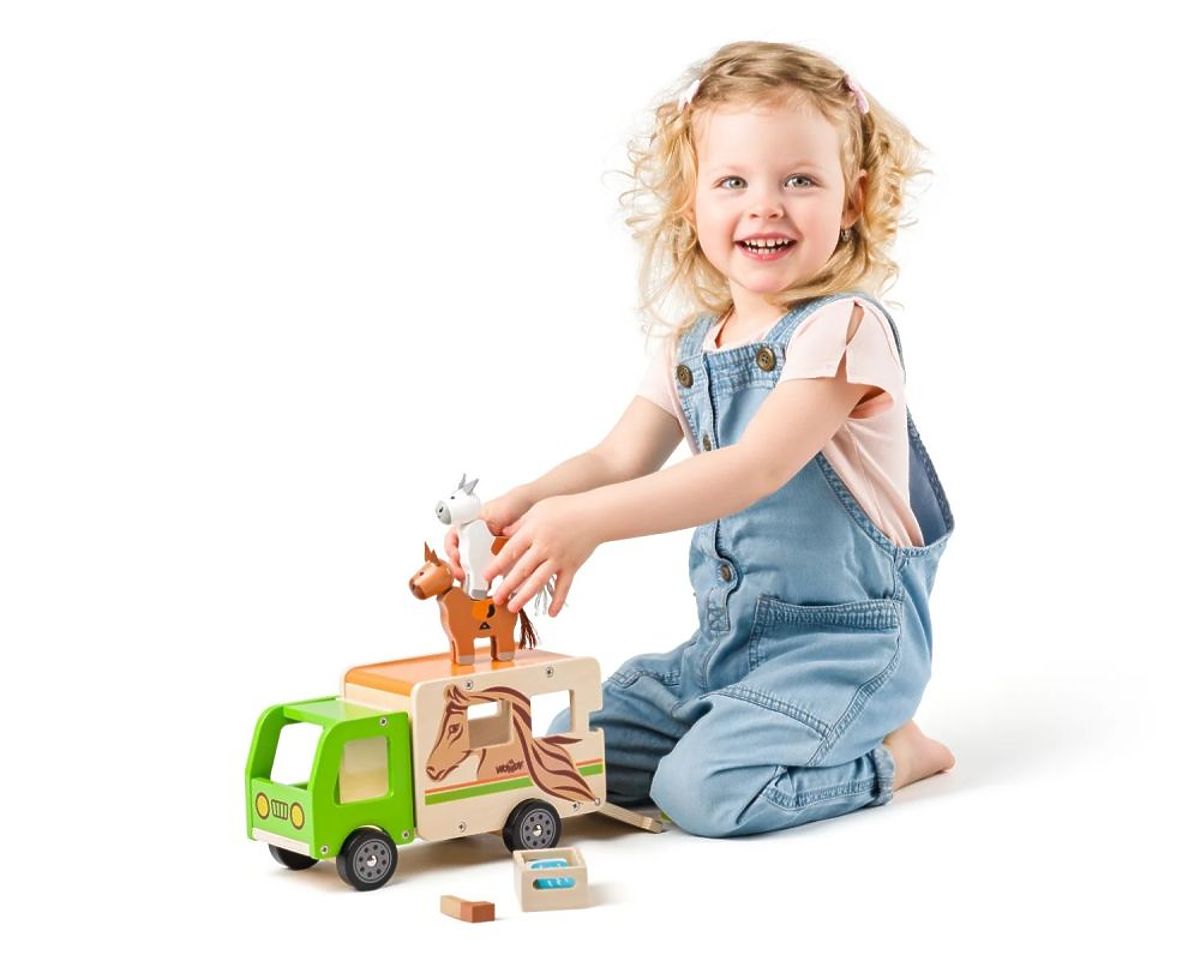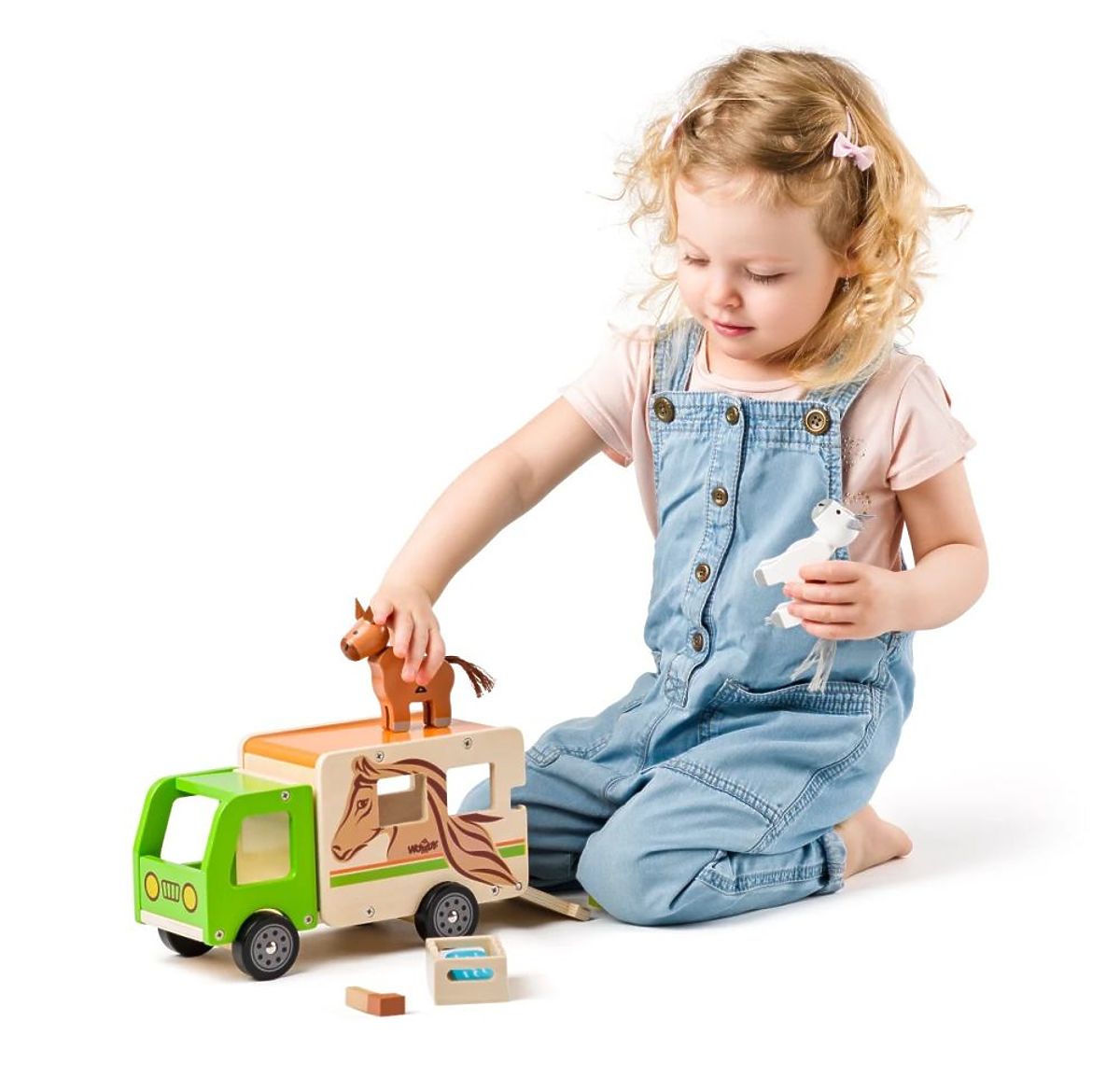 Je vaš otrok ljubitelj vseh živali, še posebej konj? Če obožuje tudi vozila, je ta igrača zanj popolna izbira. Tovornjak za prevoz konj je varna igrača za majhne otroke, ki zagotavlja veliko ur fantastične zabave. Zadnji del tovornjaka se lahko razširi, da ustvari rampo za enostaven izhod konj, stranska vrata pa omogočajo dostop skrbnikom. Set vključuje dve leseni figuri konj z nujnimi dodatki in dva skrbnika s premičnimi okončinami.