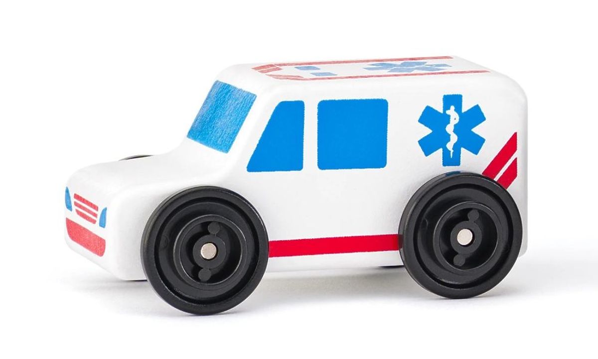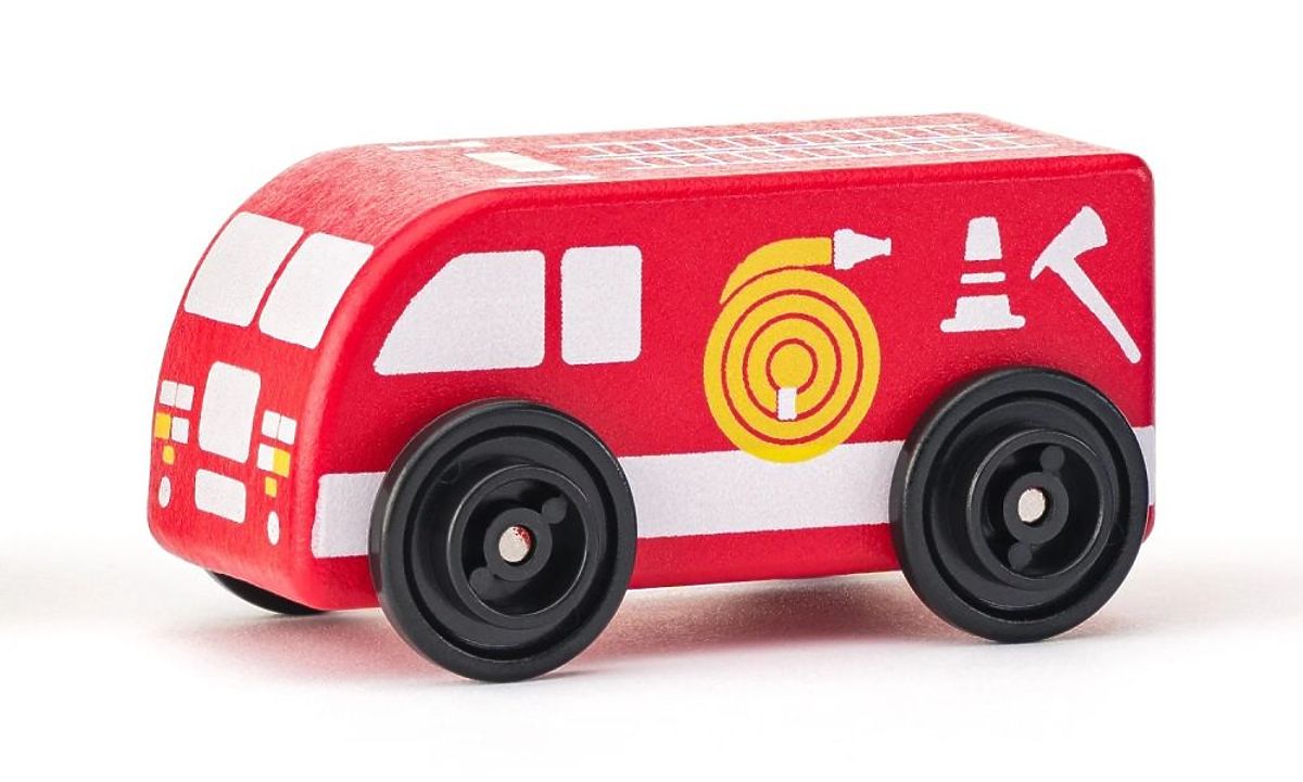 Lesena vozila z gumijastimi kolesi so idealen dodatek lesenim vlakcem in ne samo to. V kompletu boste našli gasilsko vozilo, reševalno vozilo, taksi, poštno vozilo in avtobus – vsak pripravljen na akcijo! Lahka in trpežna konstrukcija, prilagojena majhnim rokam, varna in enostavna za upravljanje. Razvija domišljijo, podpira motoriko in spodbuja k ustvarjalni igri. Ujemajo se z večino kompletov lesenih vlakcev.