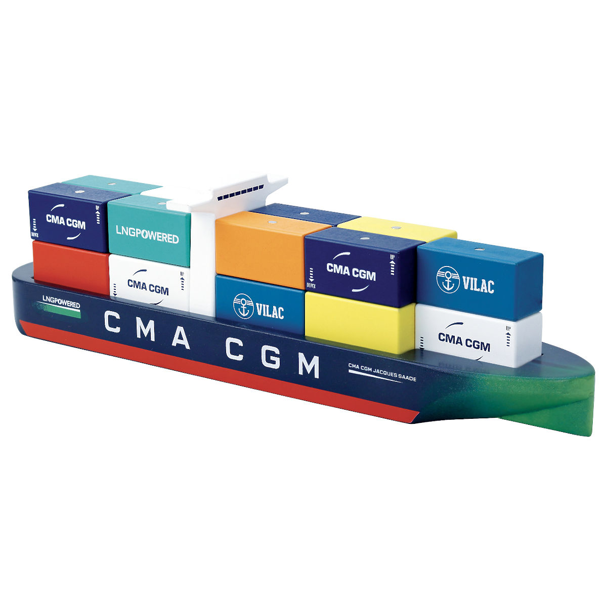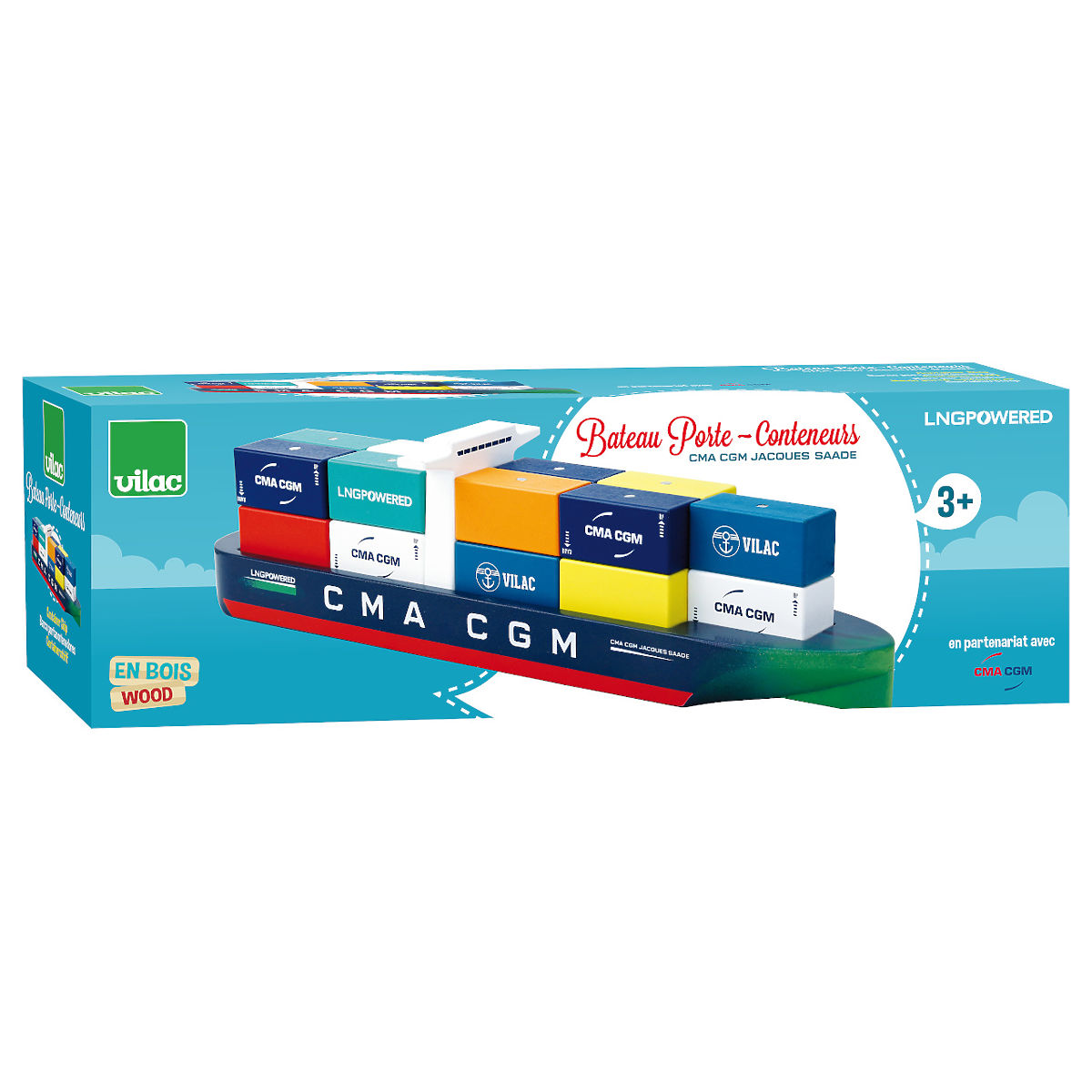 Barvita lesena tovorna ladja z magnetnimi kontejnerji je replika ladje Jacques Saadé, prve ladje, ki za pogon uporablja utekočinjeni zemeljski plin (LNG). Igrača je bila izdelana v sodelovanju z vodilnim francoskim transportnim podjetjem CMA CGM. Je del kolekcije Vilacity in je popolnoma združljiva z vsemi njenimi deli, dodatne samostojne razširitve pa prinašajo raznolikost in poglobijo igralno izkušnjo. Glavne lastnosti: ladja in 18 kontejnerjev, magnetne povezave, združljiva z vsemi deli kolekcije Vilac Vilacity, izdelano ekološko, prijazno do okolja. V2357 – Pristaniški žerjav Vilacity (ni del kompleta, na voljo v naši ponudbi): V2358 – Tovorno vozilo Vilacity (ni del kompleta, na voljo v naši ponudbi): Primer sestave ladje z drugimi deli kolekcije Vilacity: