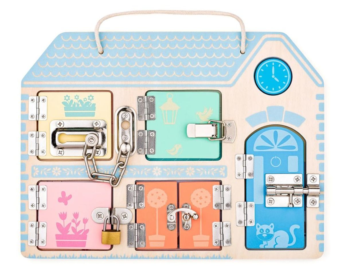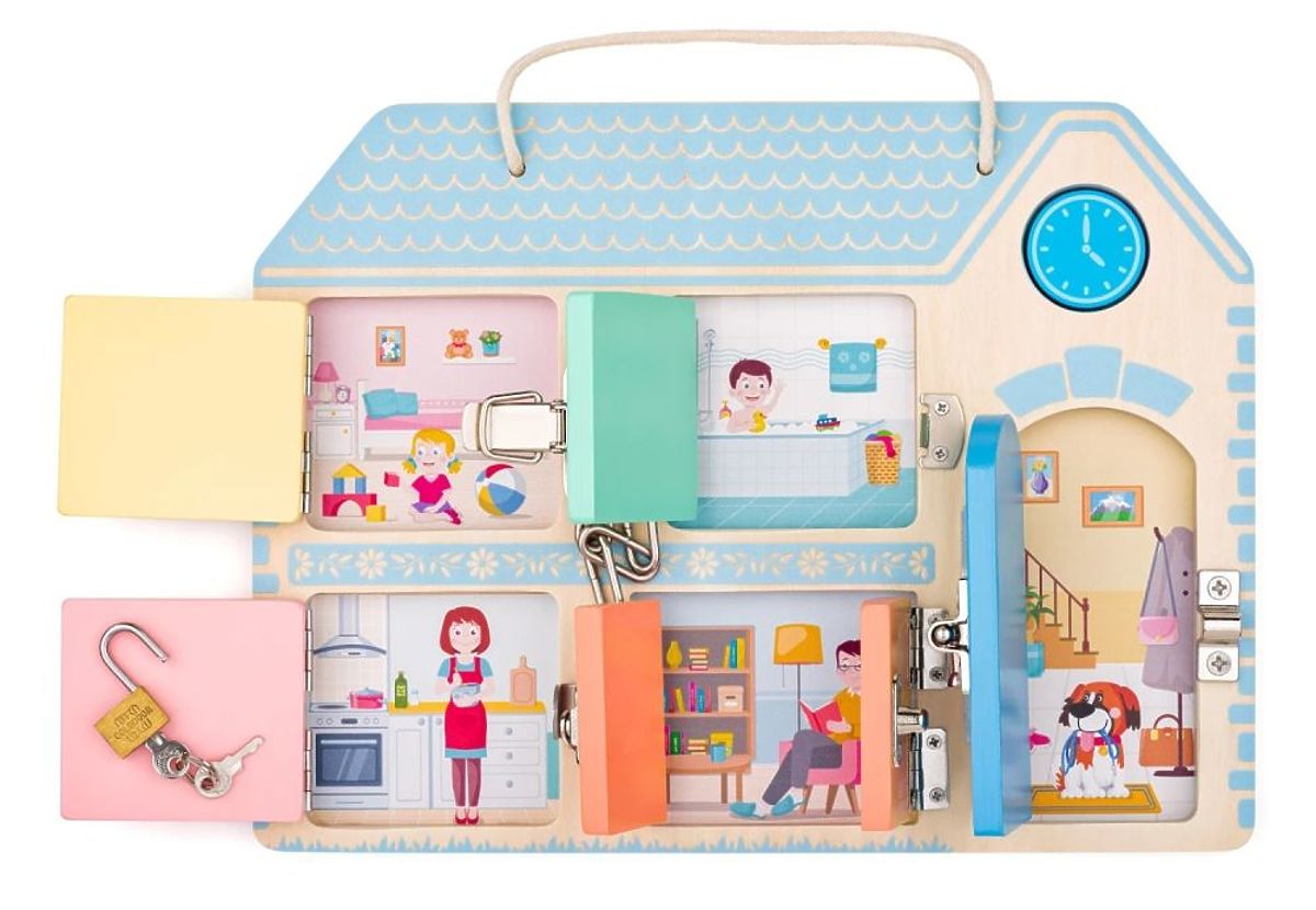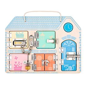 Majhne ročice, veliko odklepanja! Pet različnih ključavnic in skrivnosti za vsakimi vrati – vse to spodbuja koncentracijo, potrpežljivost in igrivo učenje. Ta izobraževalna tabla združuje motorične spretnosti in logično razmišljanje.