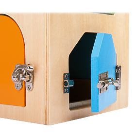 Na tej leseni hiški kakovostne izdelave ne boste našli U ključavnice in cilindrične ključavnice, raznih vijakov, vzvodov, tečajev in varnostne verige, ki urijo motorične sposobnosti otrok. Poleg tega je zelo enostaven za transport in zagotavlja "ključna" doživetja! Izdelan iz trpežnega lesa in trdnih kovinskih delov. Glavne lastnosti: razvija fino motoriko otrok, spodbuja radovednost