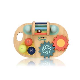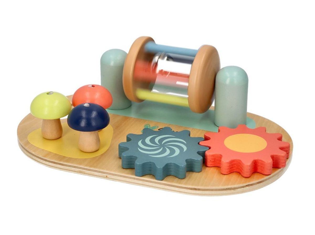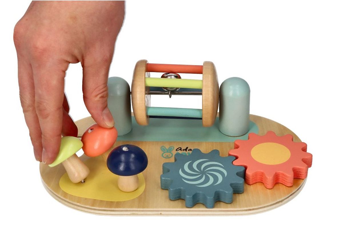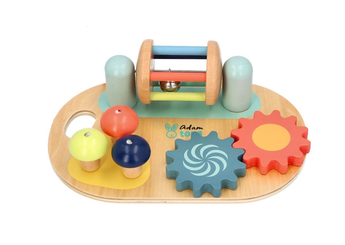 Vse atrakcije so bile pripravljene tako, da pritegnejo otroka, spodbudijo k odkrivanju in vadijo ročne spretnosti. Tabla je narejena pretežno iz lesa (razen kovinskega zvončka in palice) in je namenjena polaganju na ravno površino ali držanju v rokah zahvaljujoč okroglemu ročaju. Prav takšne igrače prinašajo otrokom največje veselje, ko je potrebno več truda, da nekaj odda zvok ali se premakne, kot le pritisk gumba pri plastičnih ekvivalentih. To je prava čarovnija znamke Adam Toys!