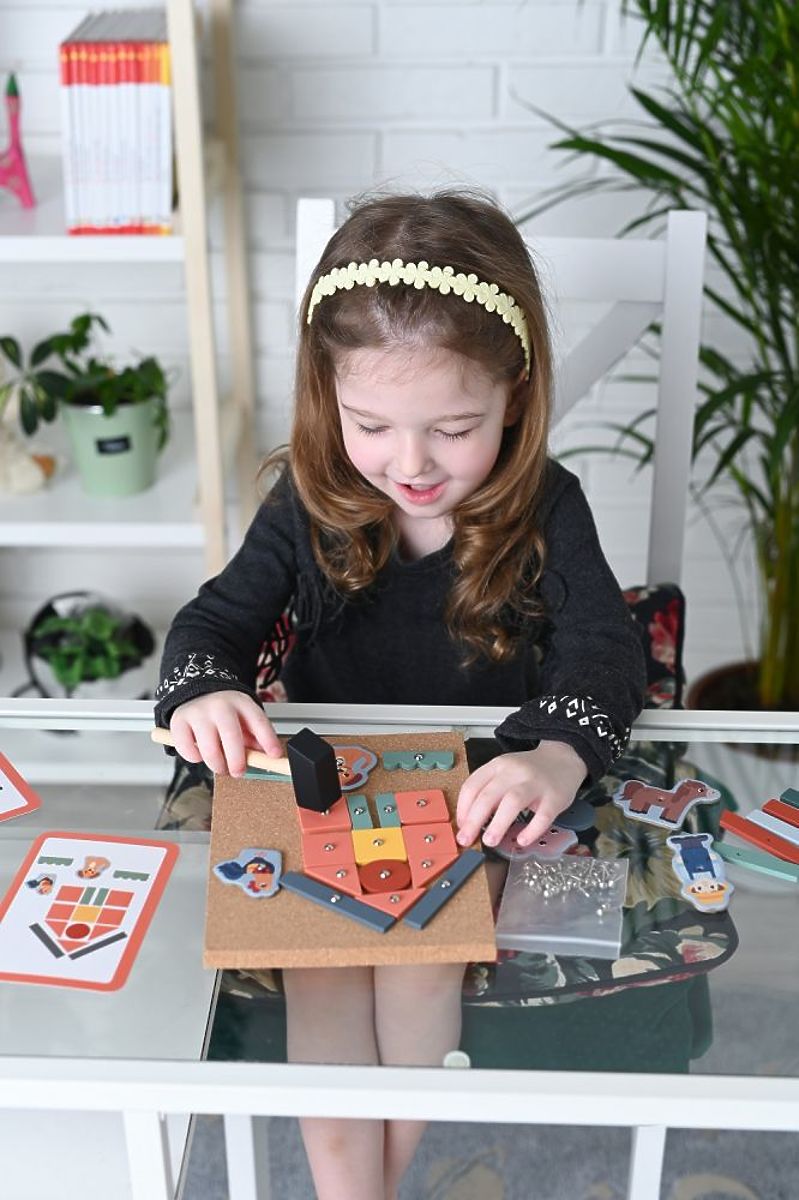 Igrača uči prepoznavanje oblik, predvsem pa razvija domišljijo in fino motoriko. In možnost dela s kladivom - to je zabavno! Celoten komplet je pakiran v lepem pakiranju, kar zagotavlja odlično predstavitev. V elementih so pripravljene luknje, da jih je lažje zabijati.