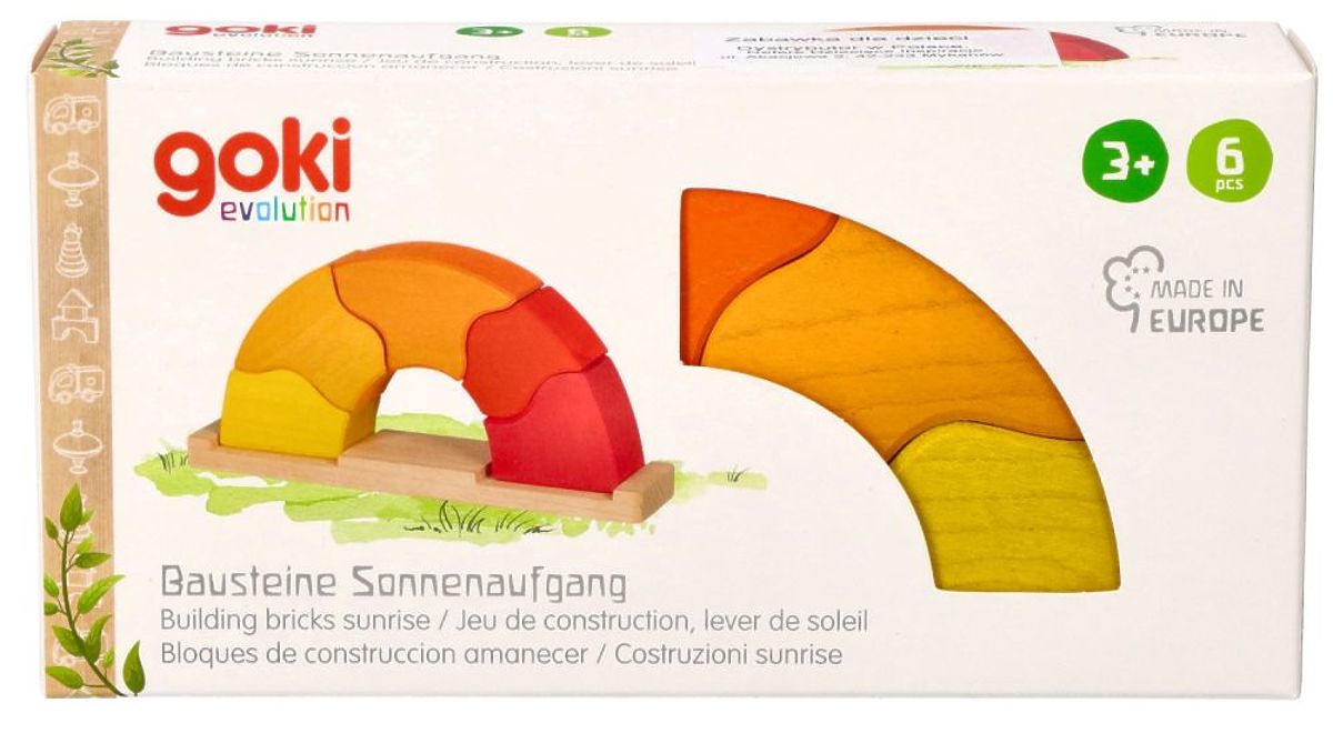 Elegantne kocke, ki predstavljajo vzhod sonca, so zanimiva sestavljanka, kjer je glavni cilj sestaviti lok. Na prvi pogled ne izgledajo kot zahtevna sestavljanka. Nič ni dlje od resnice - po odstranitvi kock iz embalaže mora otrok prilagoditi kocke podstavku in nato po oblikah ali barvah sestaviti polkrog. Kocke se lahko sestavljajo tudi izven podstavka, na primer na tleh ali mizi.