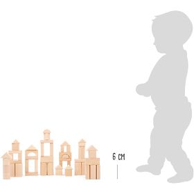 Ta komplet vsebuje veliko izbiro lesenih oblikovanih kock za gradnjo arhitekturnih mojstrovin. Mehki, zaobljeni robovi preprečujejo poškodbe med igro. Kdo bo zgradil najvišji stolp?