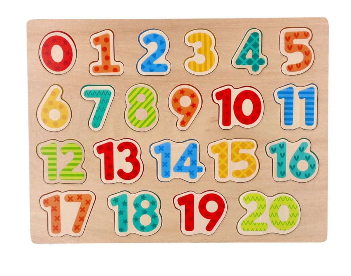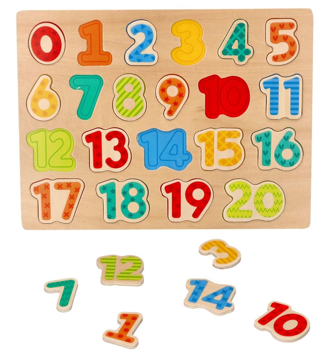 Številčne sestavljanke so klasična igrača iz naravnega lesa. Set vsebuje 21 števil: številke od 0 do 9 in števila od 10 do 20. Vsak kos sestavljanke ima .. več