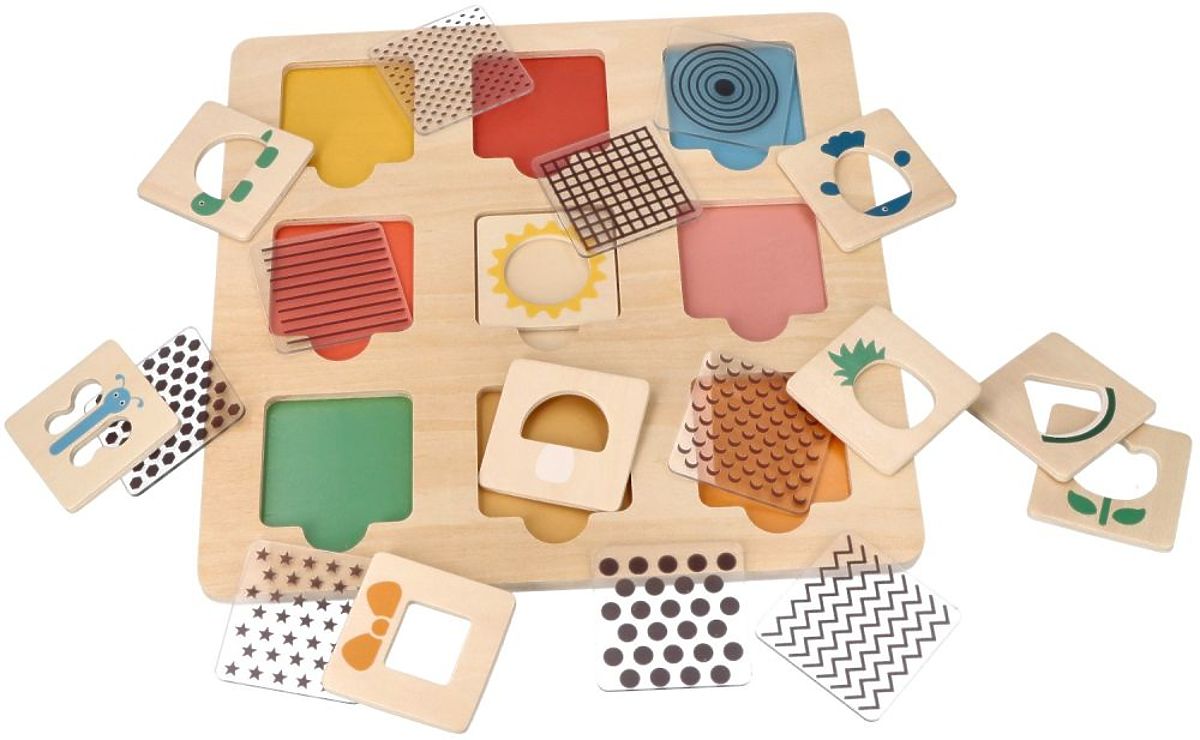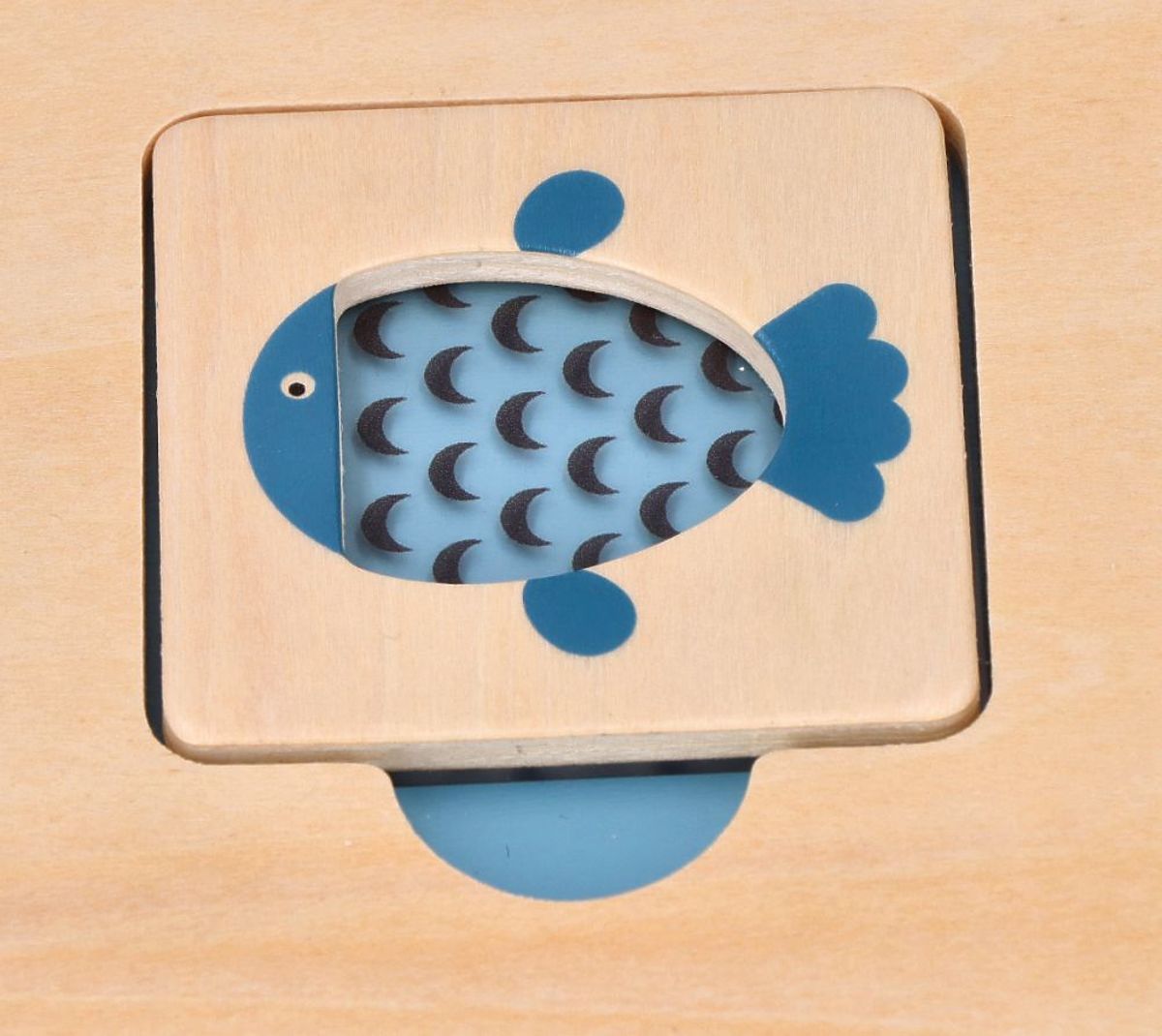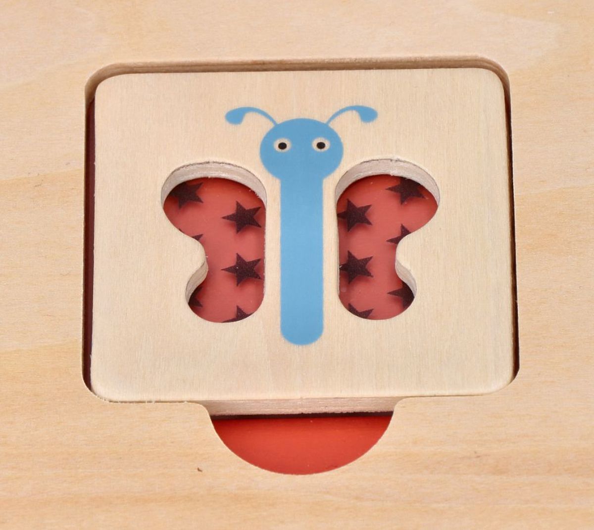 Kako deluje? Te sestavljanke sestavljajo osnova z devetimi okenci v različnih barvah. Poleg tega imamo devet lesenih plošč z izrezanimi oblikami, ki jih lahko poljubno premikamo in dobimo enake slike v različnih barvah, vendar to še ni konec. Največjo zabavo prinašajo prozorne plošče z vzorci. Ko ploščo vstavimo v okence, dobimo ne le barvo, ampak tudi vzorec. Šele zdaj, ko dodamo ploščo z obliko, se nam prikaže npr. lubenica s semeni ali mušnica s pikami. In kaj se zgodi, ko zamenjamo vzorce? Prav tu nas čaka najboljša zabava. Izkazalo se je, da vzorec z ananasa, ko ga obrnemo za 90 stopinj, odlično posnema luske ribice. Možnosti je res veliko. Zaradi tega je ta majhna igrača primerna tudi za potovanja. Odkrijte, koliko ustvarjalnih rešitev prinaša.