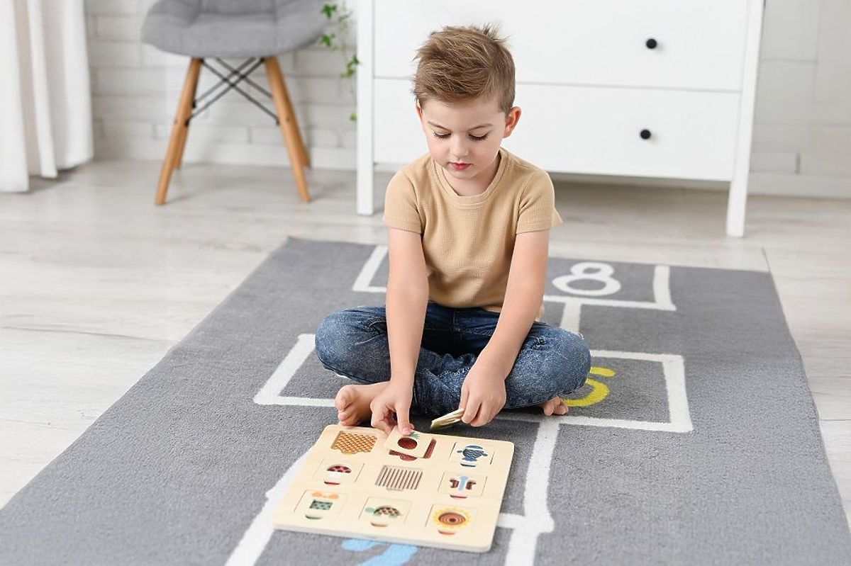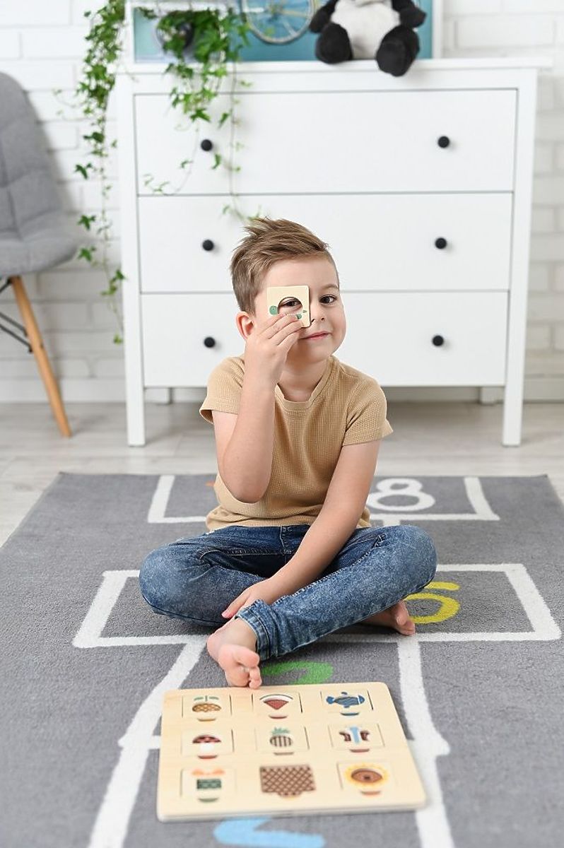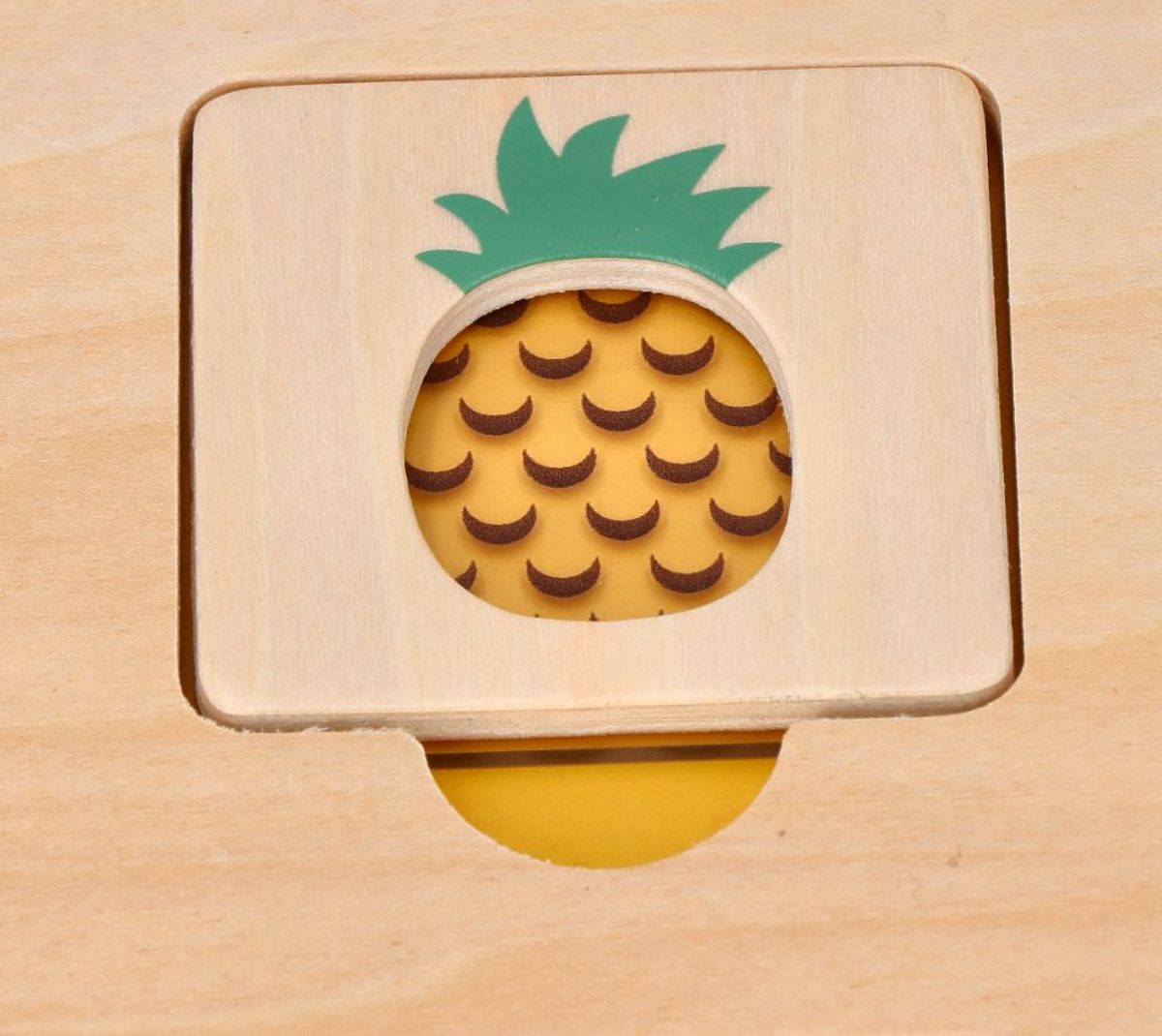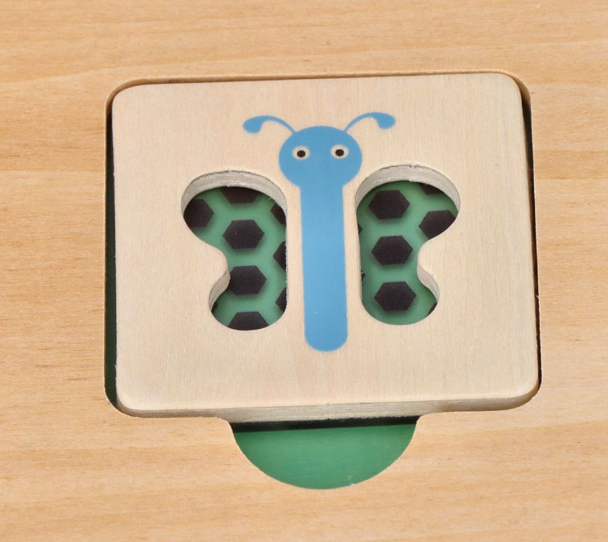 Kako deluje? Te sestavljanke sestavljajo osnova z devetimi okenci v različnih barvah. Poleg tega imamo devet lesenih plošč z izrezanimi oblikami, ki jih lahko poljubno premikamo in dobimo enake slike v različnih barvah, vendar to še ni konec. Največjo zabavo prinašajo prozorne plošče z vzorci. Ko ploščo vstavimo v okence, dobimo ne le barvo, ampak tudi vzorec. Šele zdaj, ko dodamo ploščo z obliko, se nam prikaže npr. lubenica s semeni ali mušnica s pikami. In kaj se zgodi, ko zamenjamo vzorce? Prav tu nas čaka najboljša zabava. Izkazalo se je, da vzorec z ananasa, ko ga obrnemo za 90 stopinj, odlično posnema luske ribice. Možnosti je res veliko. Zaradi tega je ta majhna igrača primerna tudi za potovanja. Odkrijte, koliko ustvarjalnih rešitev prinaša.