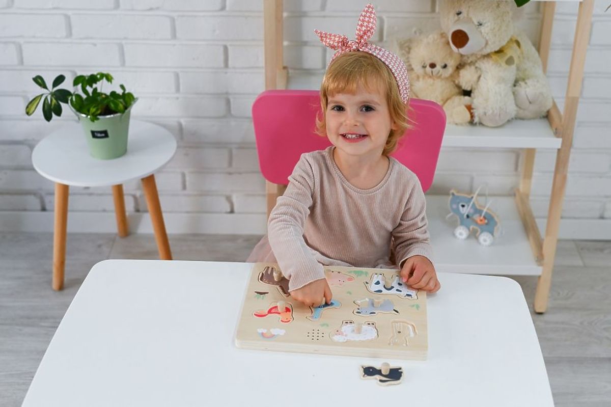 Zvočna ponudba znamke Adam Toys. Otrok se spoznava z živalmi s kmetije in hkrati prilagaja njihove oblike na pravo mesto v sestavljanki. Če pravilno postavi živali na svoje mesto, bo slišal realističen zvok, ki ga oddaja prilagojena žival. Pes laja, mačka mijavka, konj rezgeta itd. Sestavljanka je narejena iz naravnega lesa, sestavljena je iz osnove in 8 živali s kmetije. Najdete: psa, mačko, konja, prašička, kravo, ovco, raco in kokoš. Igrača odlično razvija otrokovo domišljijo, uči koncentracije in opazovalnih sposobnosti. Otrok tudi vadi ročne spretnosti, zlasti prstov, zvok pa ga dodatno spodbuja k igri.