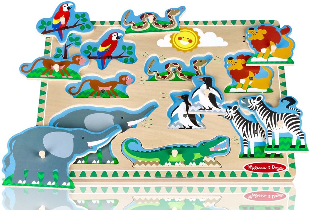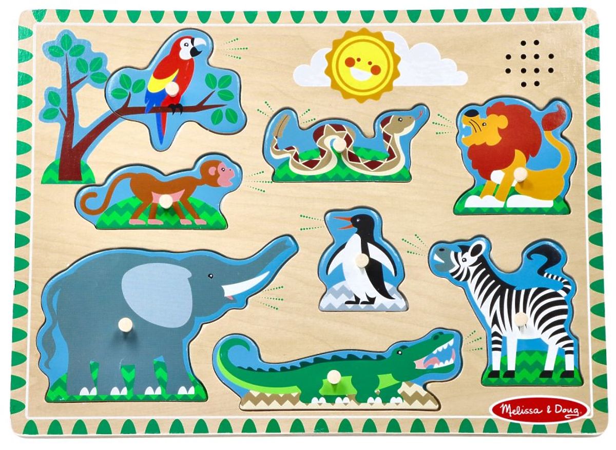 Otrok se igra s sestavljanko in prilagaja koščke praznim mestom. Ko otrok postavi žival na svoje mesto, zasliši zvok. Zvok je prilagojen določeni živali. Lev rjovi, slon trobi, kača sikne itd.