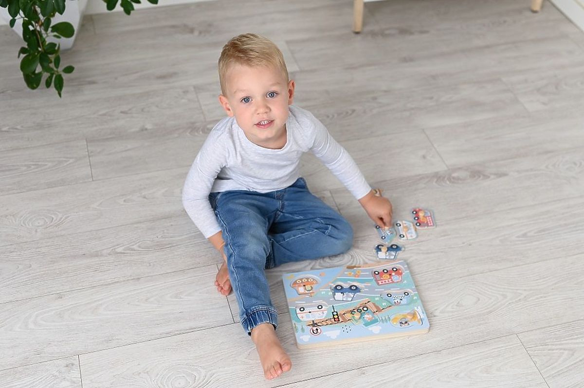 Spet glasbene sestavljanke? Tistih ni nikoli dovolj! Tokrat zvočne sestavljanke znamke Adam Toys, kar je še en predlog tega podjetja - poleg sestavljank z motivi kmetije, safarija ali orodij. Tokrat spoznavamo naše gozdne prijatelje za volanom različnih prevoznih sredstev. Naloga je seveda prilagoditi obliko živali na pravo mesto v sestavljanki. Če otrok to naredi pravilno, bo kot nagrado slišal zvok stroja, v katerem se žival nahaja, npr.: lisica kot strojevodja, rakun kot pilot ali medved kot gasilec :)