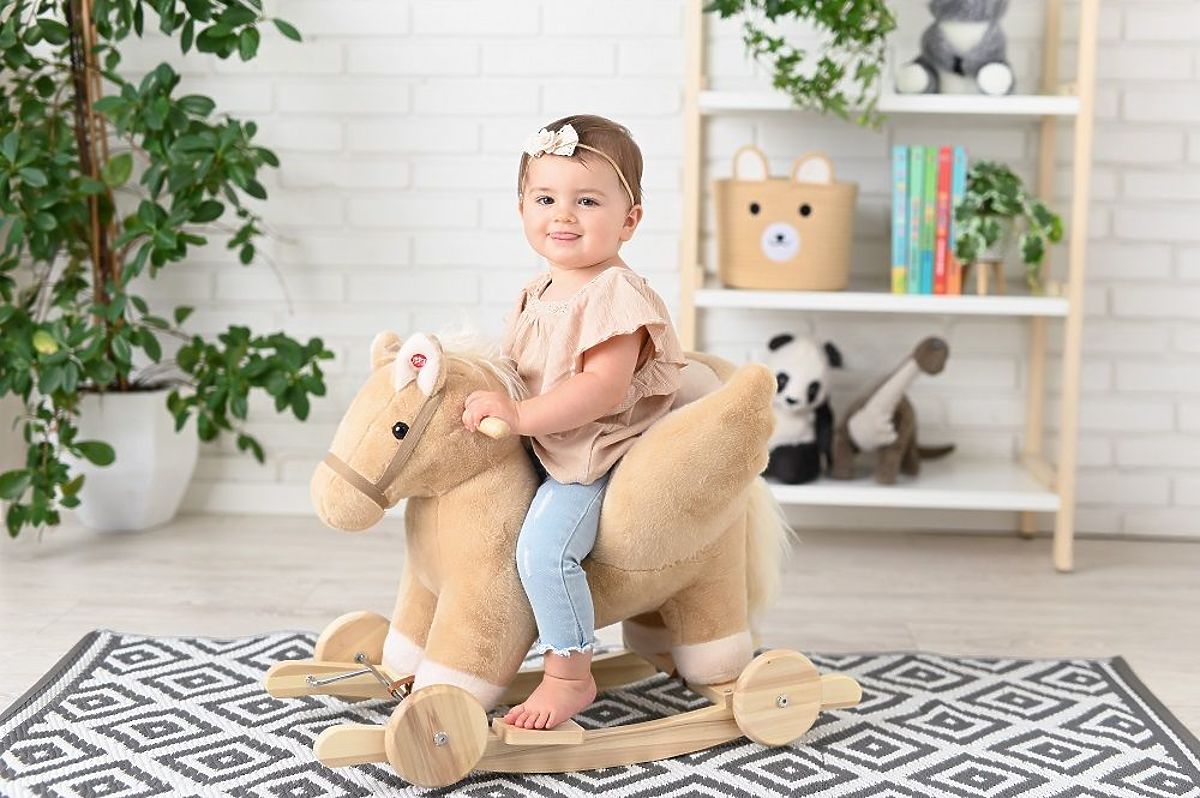 Pegaz je izdelan iz mehkega in prijetnega na dotik plišastega materiala v nežni bež barvi. Smuči in ročaji so izdelani iz lesa v naravni barvi, kar se popolnoma ujema s celotnim konceptom. Naš plišasti prijatelj ima lesena kolesa, ki omogočajo, da je glede na njihovo razporeditev lahko gugalnik ali poganjalec. Preoblikovanje iz poganjalca v gugalnik je zelo enostavno. Ni treba ničesar razstavljati, samo odpnete poseben trak in obrnete kolesa na drugo stran smuči. Končano!
