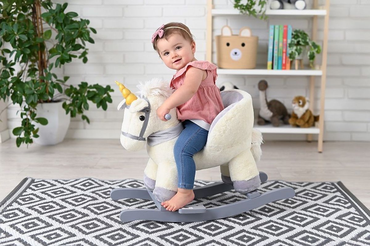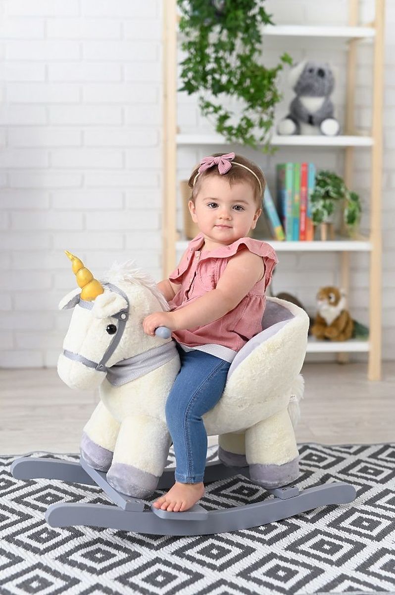 Čarobni zibajoči se samorog z zlatim rogom vam bo prinesel veliko zabave! Otroci bodo uživali v zvočnih učinkih, starši pa bodo cenili njegovo kakovostno izdelavo in sodoben dizajn. Igrača je namenjena otrokom, starejšim od 10 mesecev, ki jim zagotavlja varnost zaradi naslonjala na sedežu in varnostnega pasu.