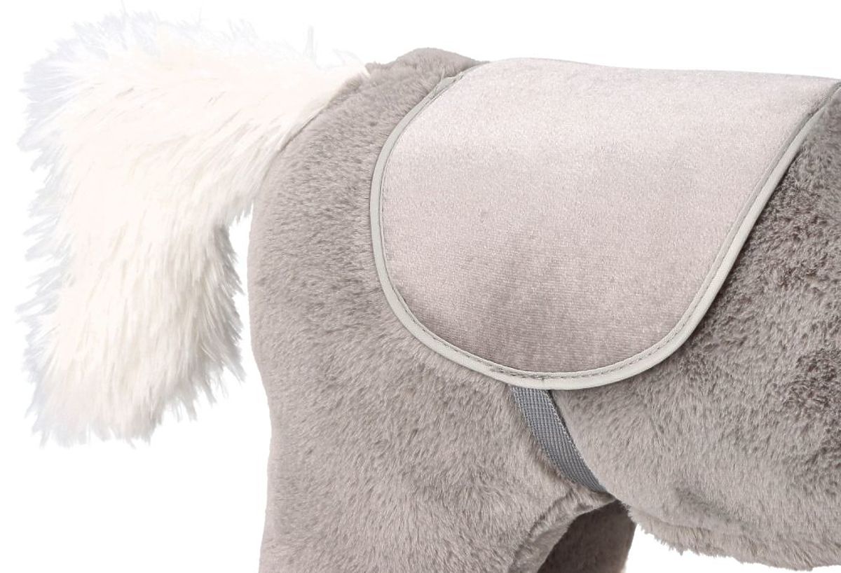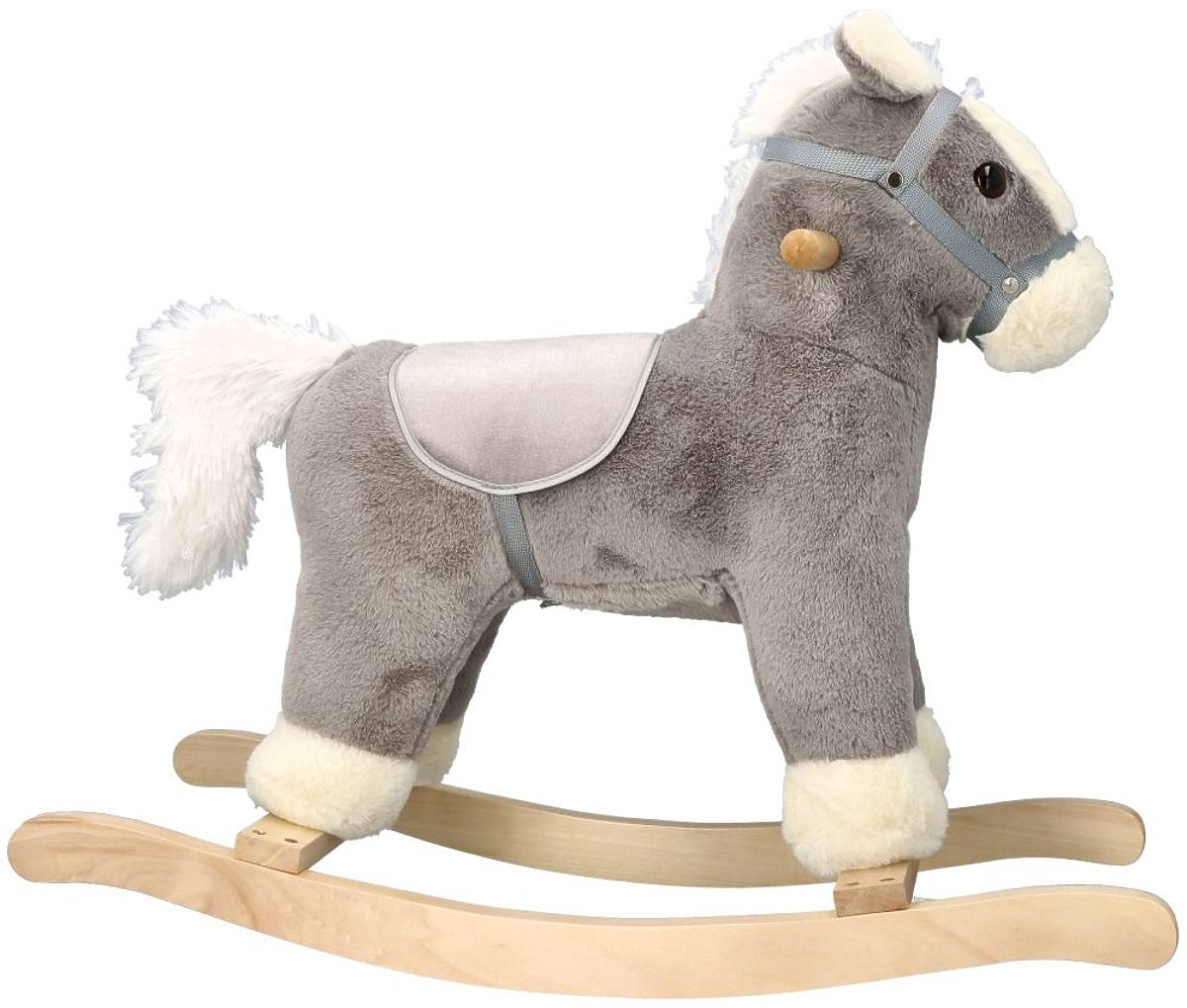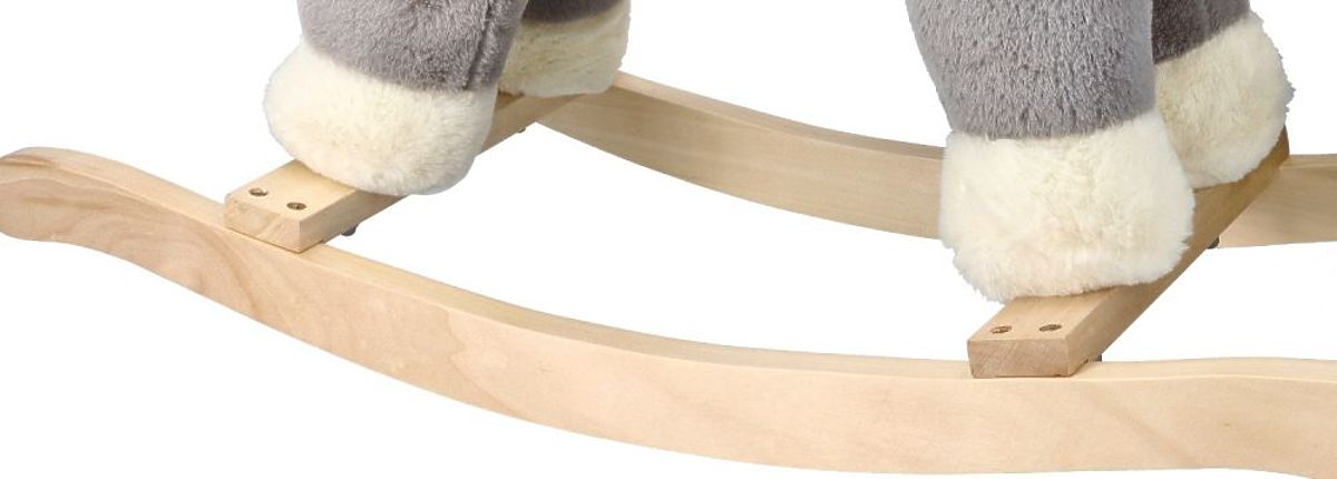 Čudovit konjiček je izdelan iz mehkega plišastega materiala v sivi barvi z belimi dodatki, kot so griva, gobec in rep. Uzda in sedlo sta izdelana v sivi barvi. Smučke in ročaji so iz lahkega in na dotik prijetnega lesa.