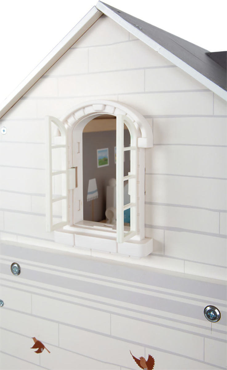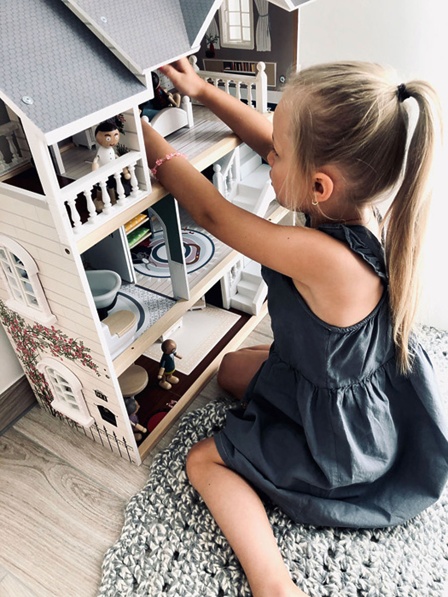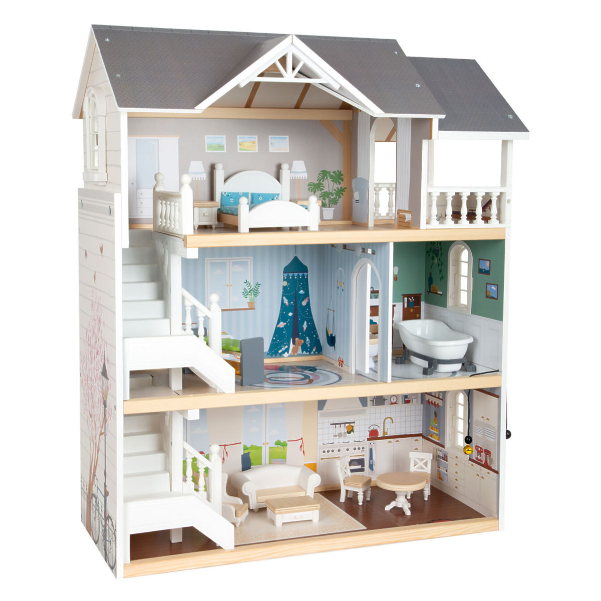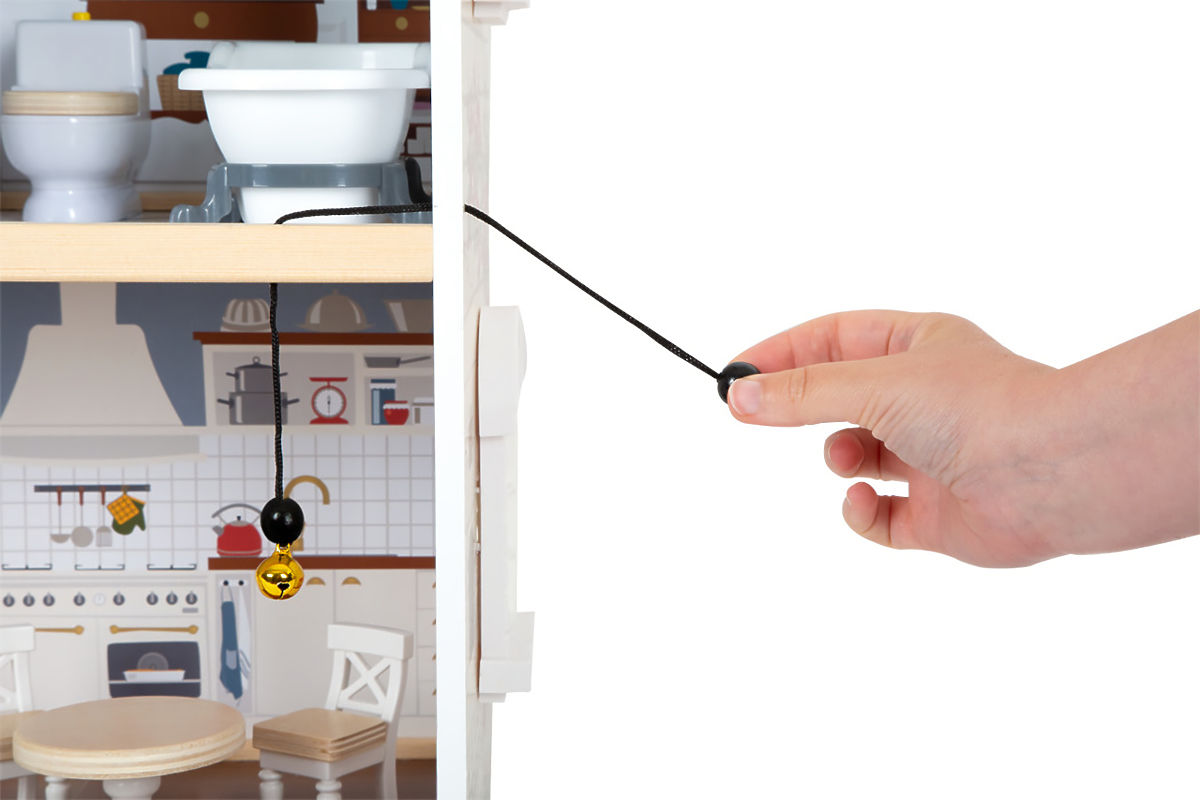 Jedilnica in dnevna soba, otroška soba in kopalnica, prav tako spalnica in loža ponujajo dovolj prostora za igro. Stopnice, drsna vrata, okna, ki jih je mogoče odpreti, nočne omarice s predali in pravi zvonec, ki naznanja prihod obiskovalcev, skupaj z 12 kosi pohištva in številnimi dodatki naredijo igro popolno zabavo. Odprta sprednja stran olajša igro in omogoča tudi več otrokom, da se hkrati igrajo s punčkami. Izdelek zahteva montažo, priložena so podrobna navodila za sestavljanje. Velika, stabilna lesena hišica za punčke s podrobnim dizajnom znotraj in zunaj hišice. Odprta sprednja stran olajša skupno igro več otrok. 3 nadstropja povezana s stopniščem, 5 sob in terasa ponujajo prostor za igro. Pohištvo z lesenimi detajli in plastičnimi deli za realistično zabavo. Funkcionalen zvonec in drugi elementi, kot so drsna vrata, okna, ki jih je mogoče odpreti, nočna omarica s predali. Glavne značilnosti: Zaradi svetle zunanje fasade in modernega dizajna se vila prilega v katerokoli otroško ali dnevno sobo. Dovolj velika za skupno igro več otrok. Funkcionalen zvonec in elementi pohištva. Vsebuje 12 kosov pohištva z dodatki. Primerno za punčke do velikosti 12 cm (npr. LE11804). Nagrada za igračo: Top 10 Spielzeug Nominiert 2021