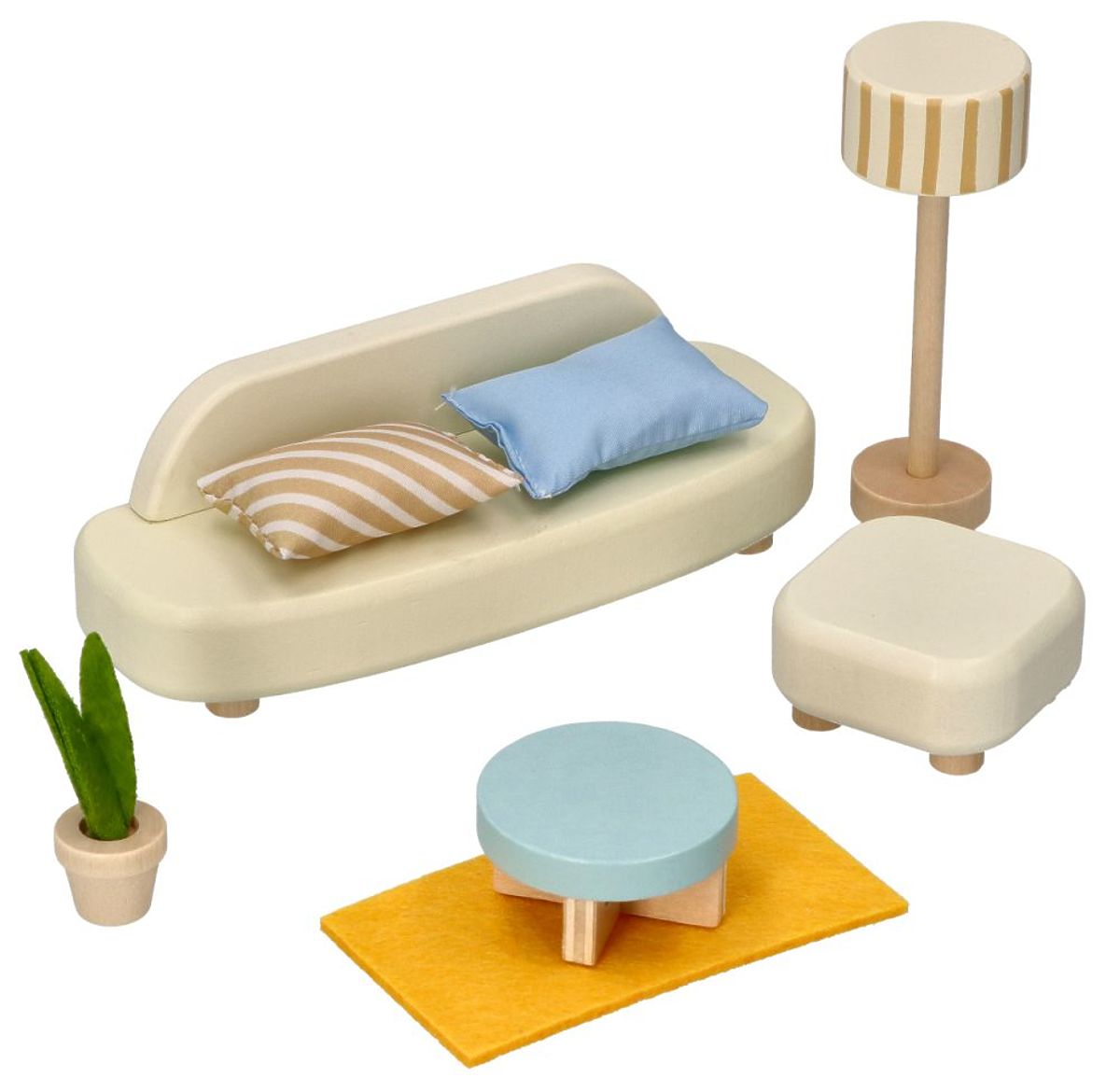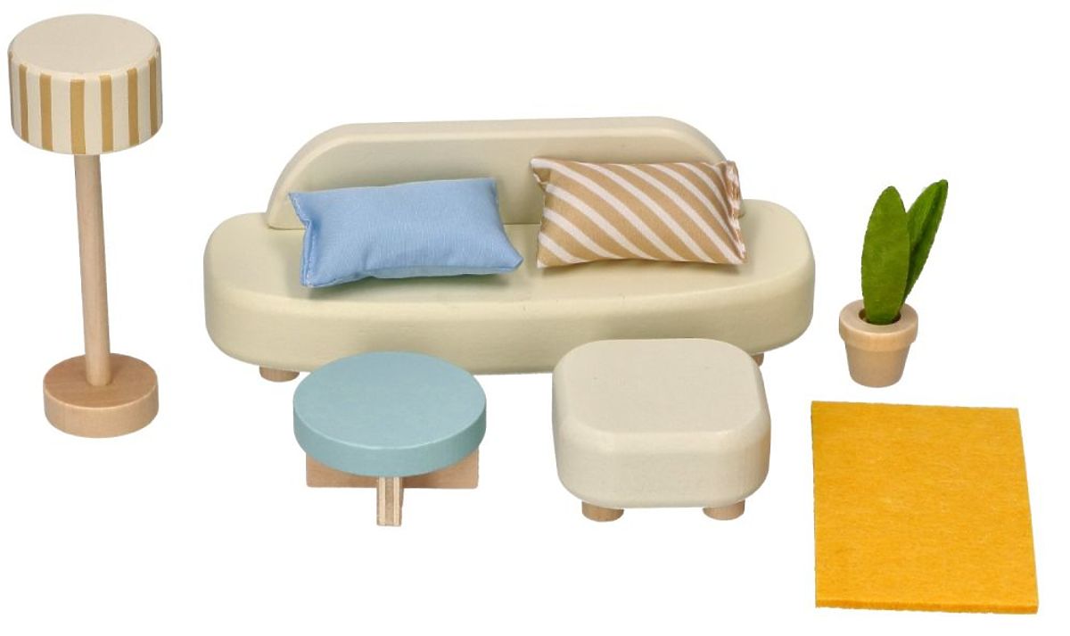Prijeten komplet pohištva za dnevno sobo, izdelan iz lesa, je idealen dodatek za punčkine hišice. Komplet vključuje elegantno zofo s taburejem, majhno klubsko mizico, stoječo svetilko in mehko preprogo – vse, kar potrebujete za ustvarjanje prijetnega, domačega interierja.