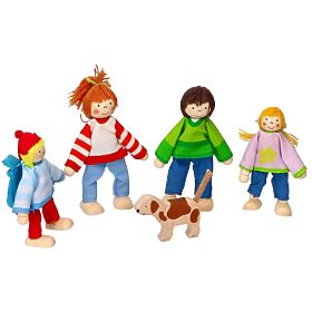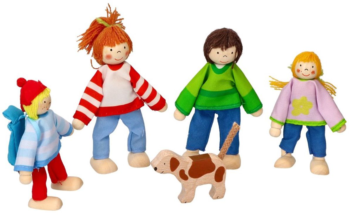 Vesela lesena družina bo odličen dodatek k hiši za punčke. V kompletu boste našli starše, dva otroka in psa. Punčki radi potujeta, zato imata s seboj tudi odstranljiv nahrbtnik.