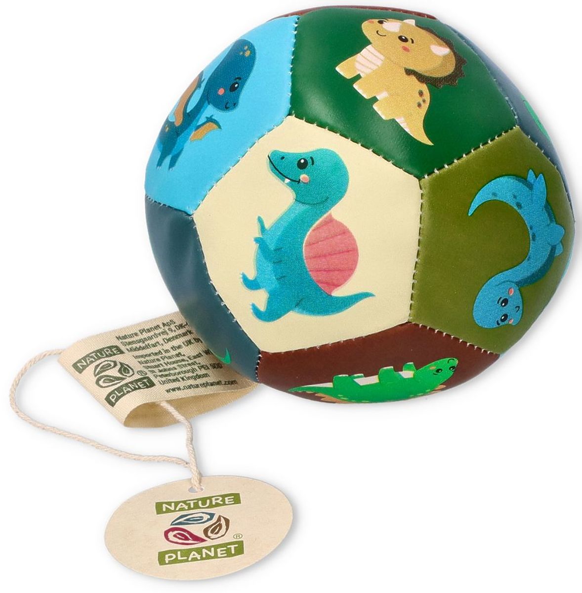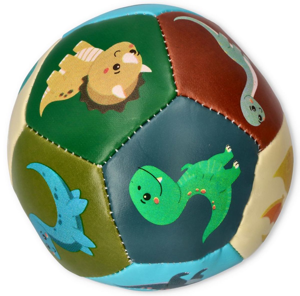 Barvna žogica z dinozavri je preprosta, klasična igrača, ki jo vsi poznajo in imajo radi. Kljub svoji preprostosti razvija motoriko in spodbuja k aktivnosti. Njena velikost je idealna za majhne roke - otrok jo lahko stiska, mečka in meče. Igranje z žogico otroku pomaga pri razlikovanju barv in razvijanju motorike rok. S pomočjo slik živali se otrok na zanimiv način uči njihovih imen. Pri igri z žogo se otrok uči sodelovanja in zdrave tekmovalnosti. Trpežna poliestrska tkanina je izjemno mehka na dotik, idealna za prve igre z žogicami.