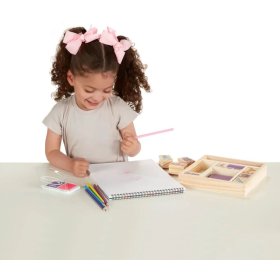 Ta veseli komplet vam omogoča ustvarjanje dokončanih umetniških del. Z barvnimi žigi in barvicami lahko otrok ustvarja slike, voščilnice in razglednice. Prepričajte se sami, koliko zabave vam bo prinesla ta preprosta in funkcionalna igrača.
