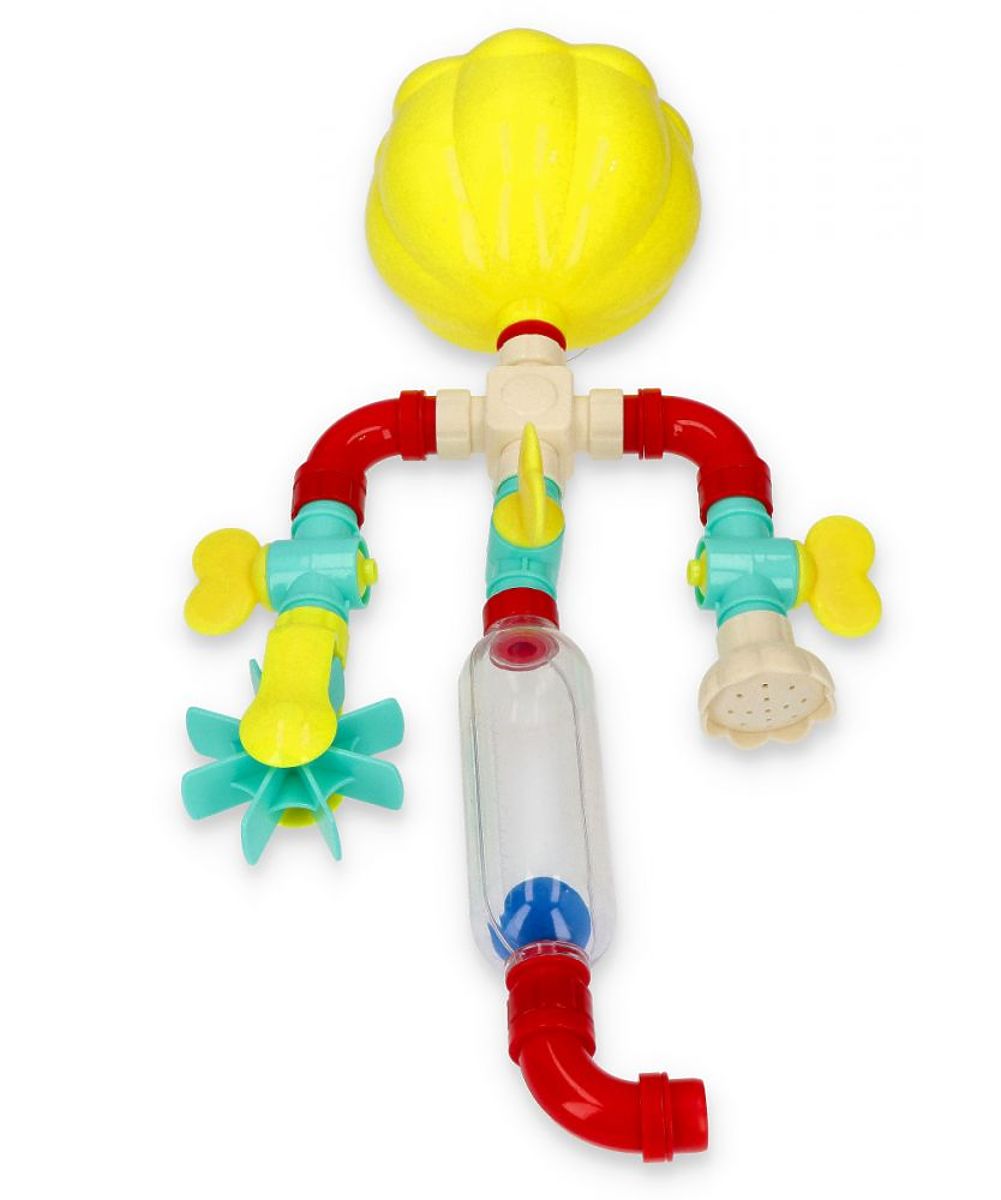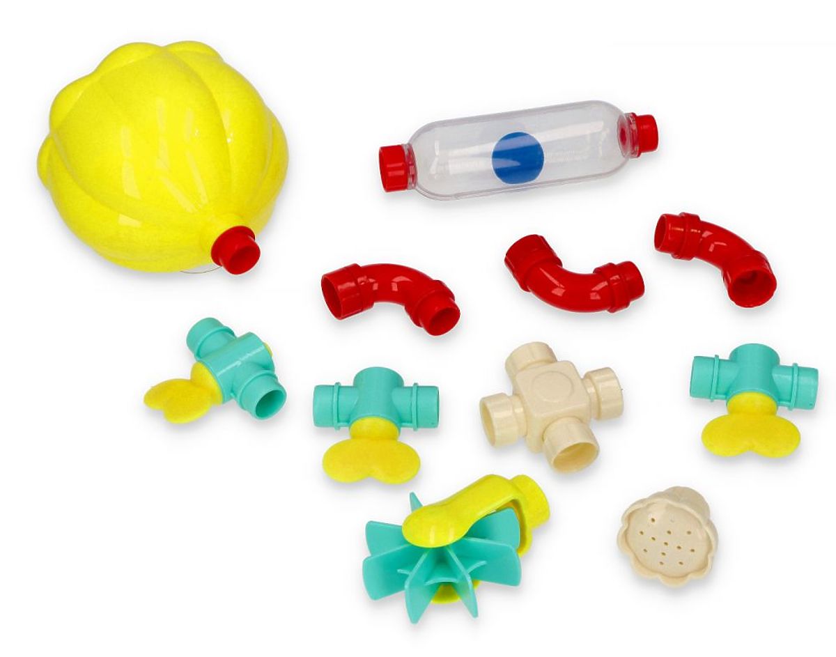 Igračo lahko upravlja en otrok ali dva sorojenca med skupno kopeljo. Odrasla oseba naj poveže vse dele po sliki na škatli ali po lastnih željah. Deli se preprosto vstavijo drug v drugega, za montažo niso potrebna dodatna orodja. Zdaj je treba le pritrditi glavni element (rumeni rezervoar za vodo) na steno s pomočjo priseskov na zadnji strani in zabava se lahko začne. Nastavite pipe v zaprti položaj. S pomočjo skodelice, na primer za čiščenje zob, napolnite rumeni rezervoar z vodo. Začnemo odštevanje ... 3 ... 2 ... 1 ... GREM! Odločitev, kje bo voda tekla, je vaša. Lahko je to tuš glava ali vodno kolo. Pri tem pozorno opazujte, kako se obnaša kroglica v rezervoarju. Zabavo lahko ponavljate v neskončnost.