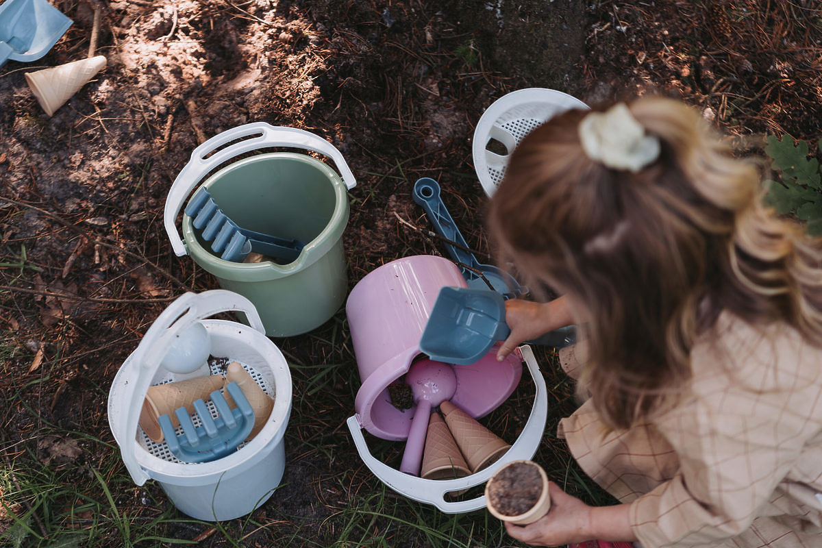 Čudovit set za peskovnik v nežno roza barvi iz plastike z nordijskim znakom za okolje . Set, ki vsebuje vedro, cedilo, lučke za sladoled in druge potrebščine za .. več