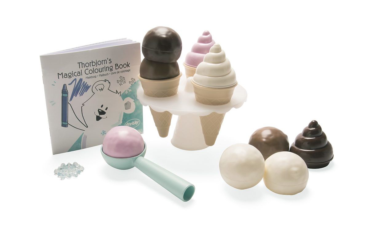 Čudovit sladoledni set iz plastike z Nordic Ecolabel . V kompletu so sladoledne lučke, žlice za sladoled in ostali lepi pripomočki za pripravo domačega sladoleda. S toliko možnostmi lahko postrežete najrazličnejše sladolede na priloženem držalu. Komplet je primeren za igro v zaprtih prostorih, na prostem in na snegu. V kompletu je tudi lična pobarvanka, kjer lahko pobarvate čarobni svet.