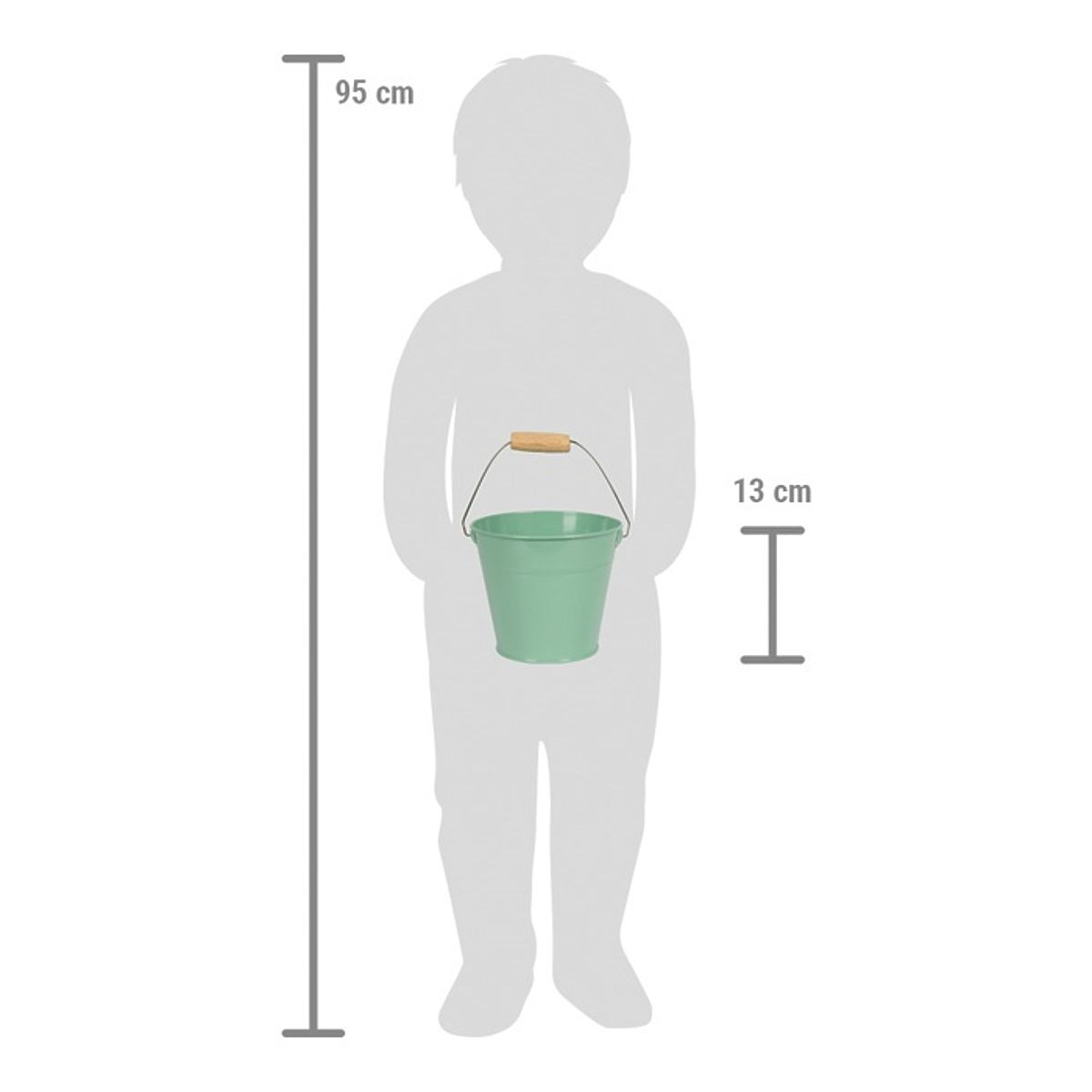 Dimenzije: višina vedra cca 14 cm, Ø cca 15 cm, vrtno orodje: cca 6,5x2,5x22 cm