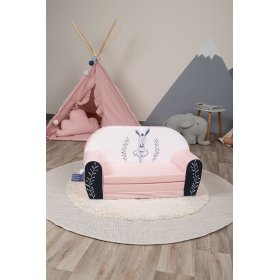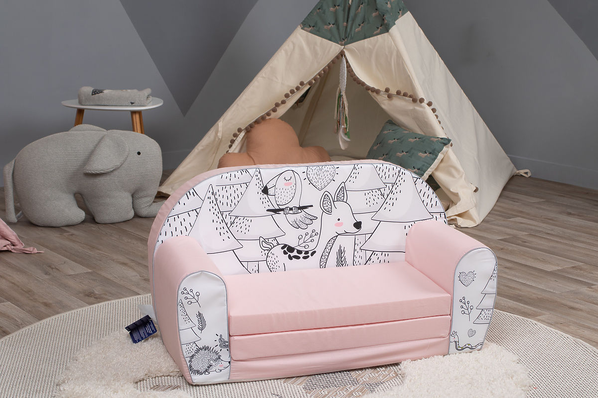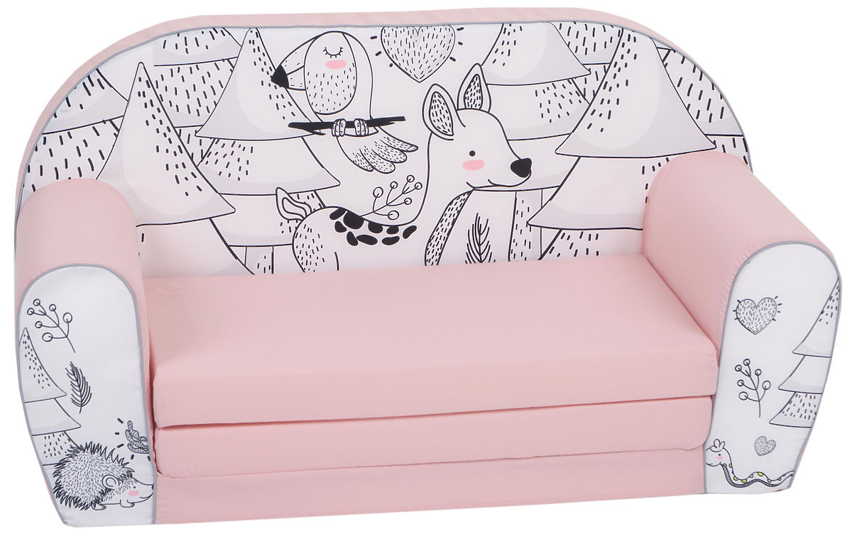 Barvita sedežna garnitura z motivom srne in gozdnih živali. Kombinacija roza blaga in črno-belega potiska je primerna za dekliško sobo. Otroška sedežna garnitura je izdelana iz mehke in lahke pene. To zagotavlja, da je varen in praktičen za vsakodnevno uporabo.