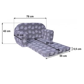 Kavč s psom v univerzalni sivi izvedbi je lahek, tako da ga lahko otrok zlahka premakne, odvije in zloži. Primeren je ne samo za otroške sobe, temveč tudi za vrtce ali otroške kotičke.