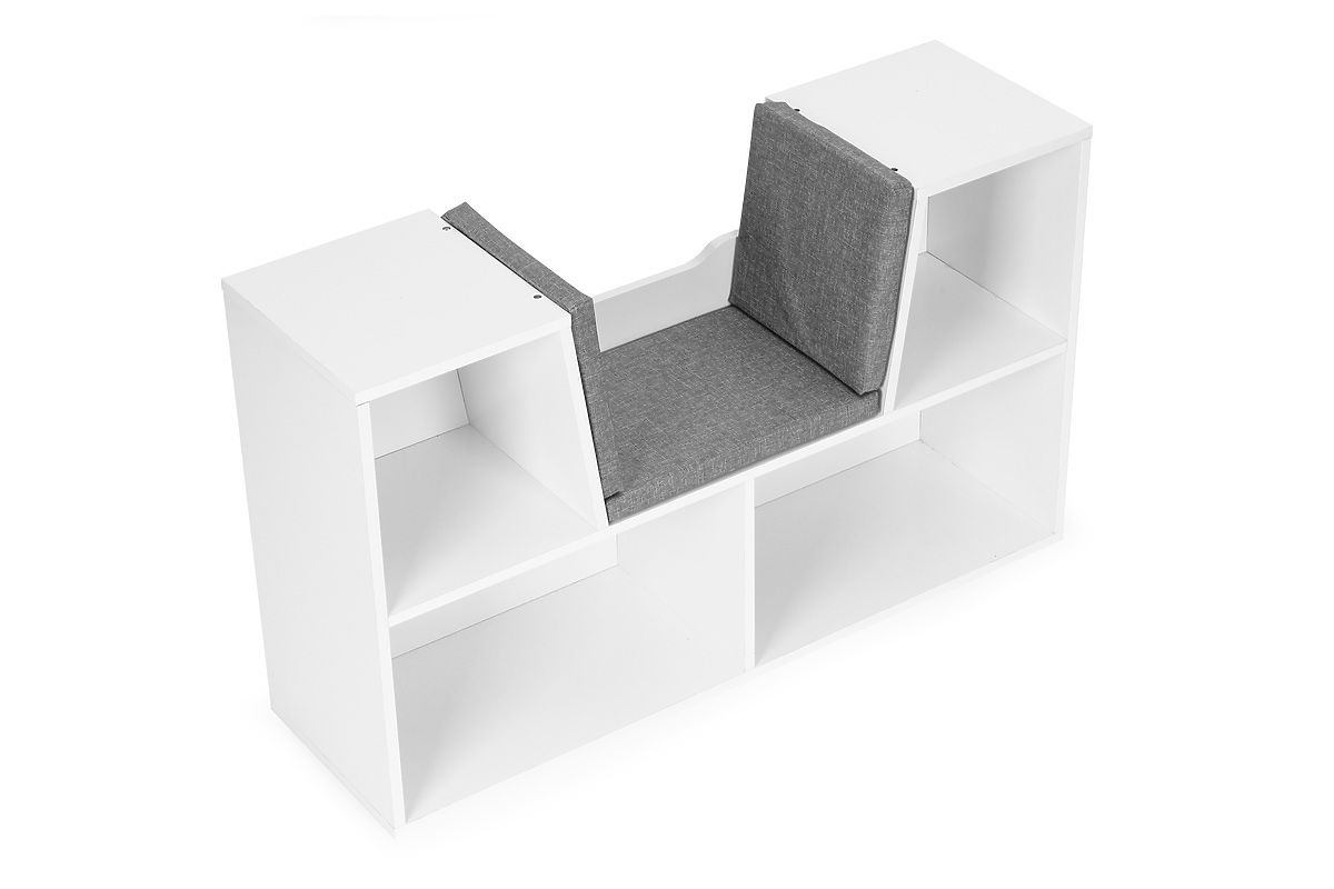 Zahvaljujoč preprosti obliki se bo polica s sedežem popolnoma prilegala v kateri koli tip in značaj notranjosti, v predsobi pa bo služila kot funkcionalen kos pohištva za shranjevanje čevljev in pomočnik pri obuvanju, zahvaljujoč posebnemu mestu, lahko otrok med obuvanjem udobno sedi. V otroški sobi ali igralnici bo regal služil kot odličen prostor za shranjevanje , predvsem pa bo poskrbel, da bo vse v redu. Prostorne police in predelki hranijo najljubše knjige, igrače in vse, kar ima vaš otrok rad pri roki.
