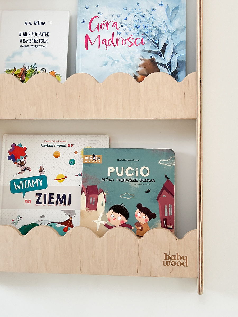 Polica WAVE L v naravni barvi je praktična in dekorativna knjižna polica na steni, ki pomaga ohranjati red v otroški sobi, ne da bi zavzela prostor na tleh. Idealna je za knjige, igrače, dekoracije ali drobne predmete vašega otroka. Zaradi montaže na steno ostane tla prosta za igro in gibanje, kar cenijo tako otroci kot starši. Naravni videz in kakovostna izdelava police dodajata otroški sobi prijeten in domač pridih. Zaobljeni robovi in gladke površine zagotavljajo varno uporabo tudi za najmlajše.