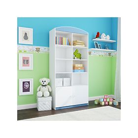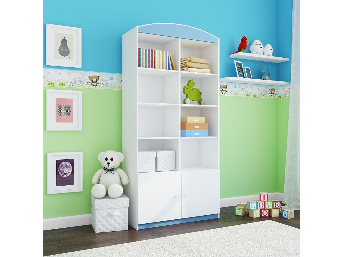 Potřebujete někam uložit hračky, knihy, oblečení nebo další nezbytné věci, které musí být v dětském pokojíčku? Pak sáhněte po krásném policovém regálu s dvířky. Modré prvky dodávají na kráse.