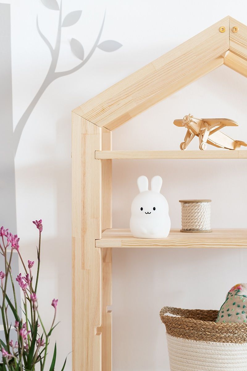 Policový regál do dětského pokoje ve tvaru domečku zaujme svým kvalitním a hladkým zpracováním. Regál disponuje třemi nastavitelnými policemi. Vlastnosti:- 3 .. več