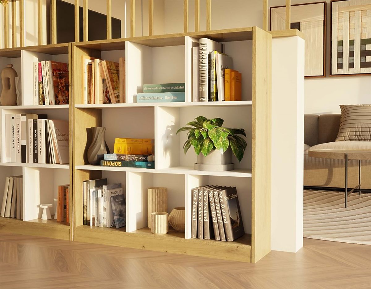 Vsebuje 8 prostorskih predelkov, ki pomagajo pri organizaciji prostora in omogočajo estetsko razstavljanje priljubljenih predmetov. Kombinacija toplega odtenka hrasta artisan s kontrastnimi belimi policami daje pohištvu sodoben in eleganten značaj.