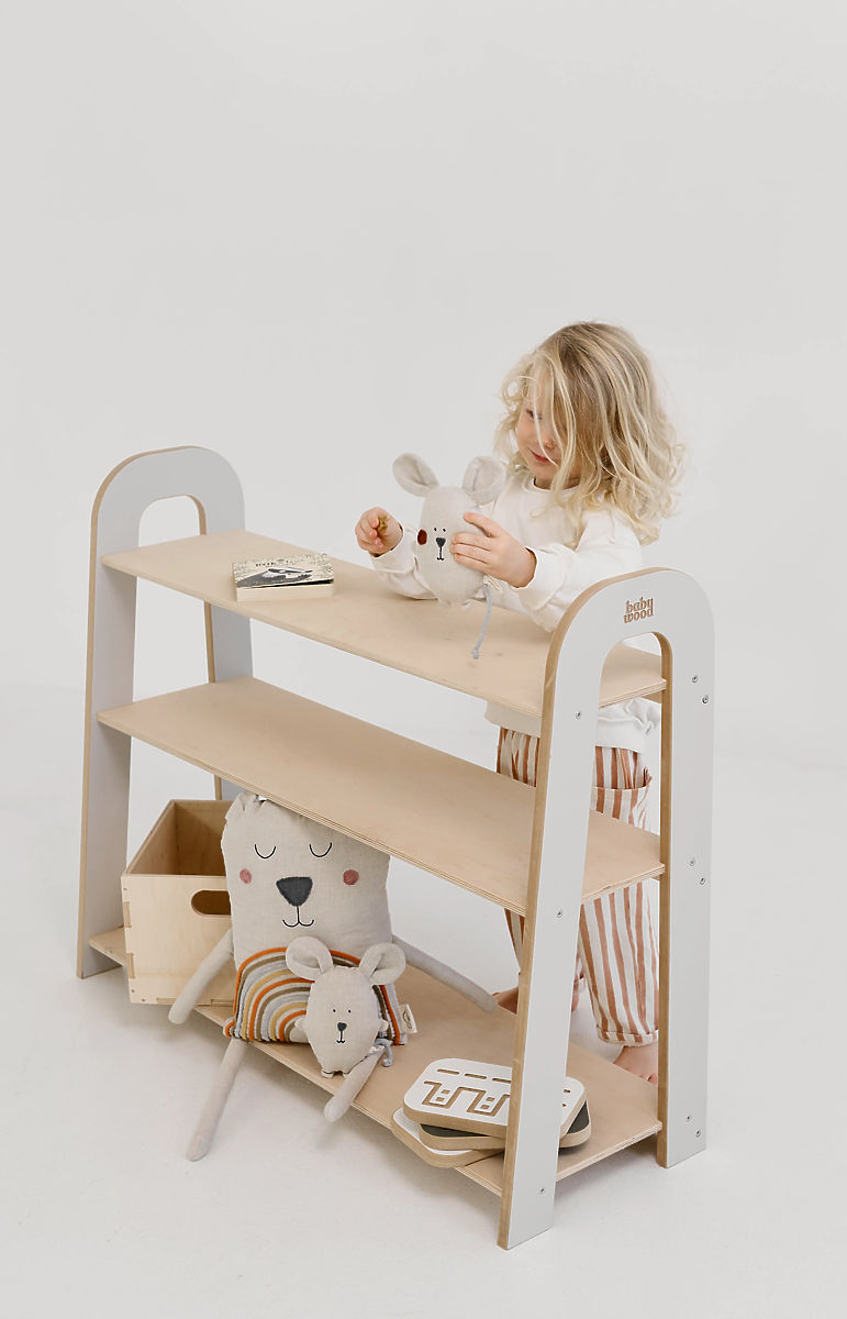 Odprti regal SLIM L je praktična in estetska rešitev ne le za shranjevanje knjig, temveč tudi za ustvarjanje prijetnega vzdušja v otroški sobi. Zasnovan je z mislijo na potrebe malih bralcev in jih naravno spodbuja k branju, odkrivanju zgodb in samostojnemu vzdrževanju reda. Zaradi odprte zasnove lahko otroci knjige enostavno izbirajo, jih pregledno razstavljajo in vračajo na svoje mesto. Tri široke police omogočajo shranjevanje knjig različnih formatov in velikosti. Višina regala je prilagojena otrokom, tako da ga lahko uporabljajo brez pomoči odraslih. Regal hkrati služi kot nežen dekorativni element, ki otroški sobi doda prijetno in mirno vzdušje.