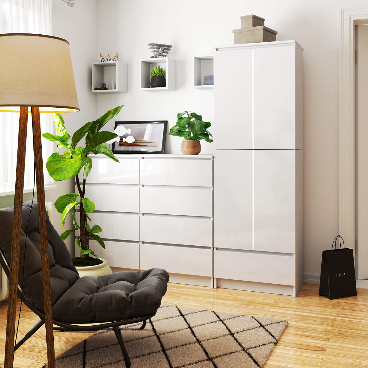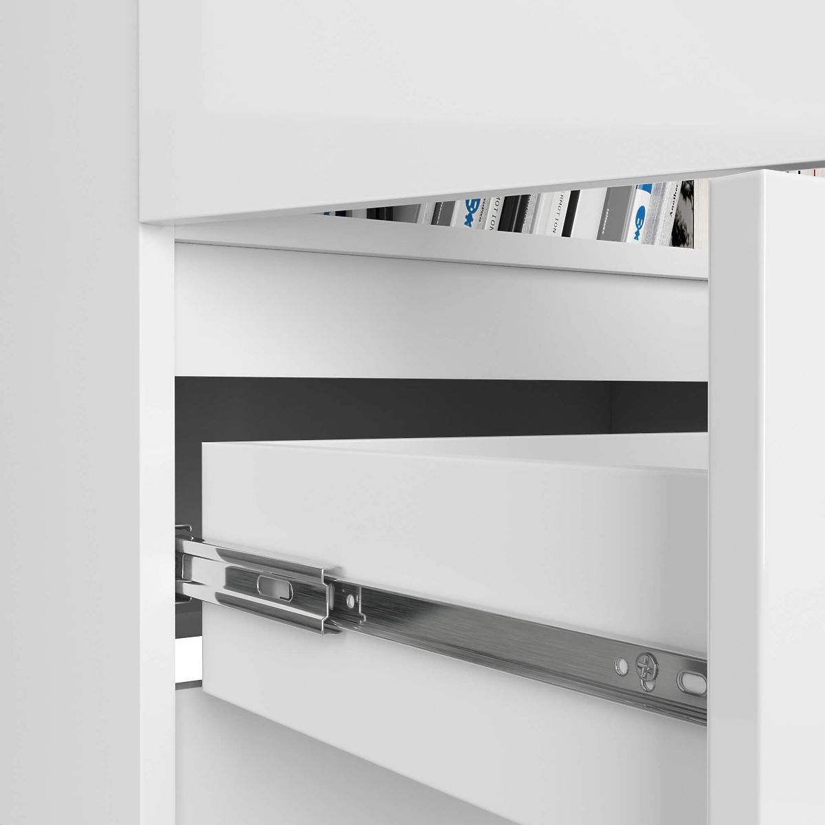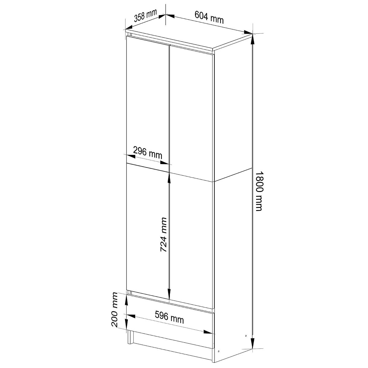 Bela pisarniška knjižnica s predalom je popolna kombinacija funkcionalnosti in vizualne privlačnosti. Pohištvo je praktično in enostavno za vzdrževanje v popolni čistoči, hkrati pa je zelo učinkovito. V zaprtem delu se nahajajo prostorne police, medtem ko je v spodnjem delu prostoren in enostavno izvlečen predal. Uporaba knjižnice je zelo univerzalna in odvisna od individualnih potreb. V omari lahko shranjujete knjige, mape z dokumenti in pisarniške potrebščine, prav tako pa jo lahko uporabite za namizni pribor, prte ali brisače. Barva klasične bele in preprosta oblika knjižnice zagotavljata, da se pohištvo prilega vsakemu interierju, ne glede na barvo sten ali stil, v katerem je urejeno. Pohištvo je izdelano iz trpežnega materiala, ki je laminirana plošča, odporna proti obrabi in poškodbam. Robovi omare so obloženi z vzdržljivim in estetskim ABS robom. Čela knjižnice so lakirana na visok sijaj, kar pohištvu dodaja dodatno eleganco. Zgornja in spodnja vrata sta združena v eno celoto in se ne odpirata ločeno.