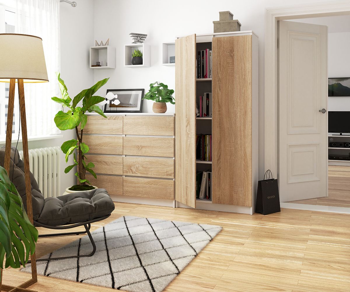 Pisarniška omara R 80 cm Clip 2 je pohištvo v barvi bela/sonoma, kar je ena izmed najbolj priljubljenih barv te sezone. Ta knjižnica bo prinesla red in harmonijo v vašo pisarno. Opremljena je z osmimi prostornimi policami, v katere lahko shranite vse potrebne stvari v pisarni. Poleg tega so njeni robovi oblepljeni z ABS robom, ki zagotavlja visoko zaščito pred poškodbami. Med prednosti te knjižnice spadajo:
