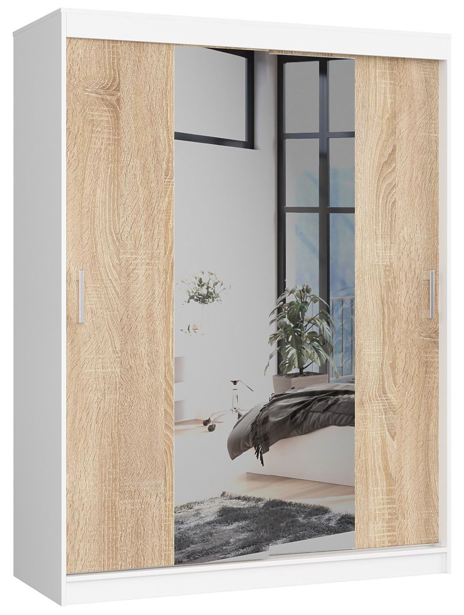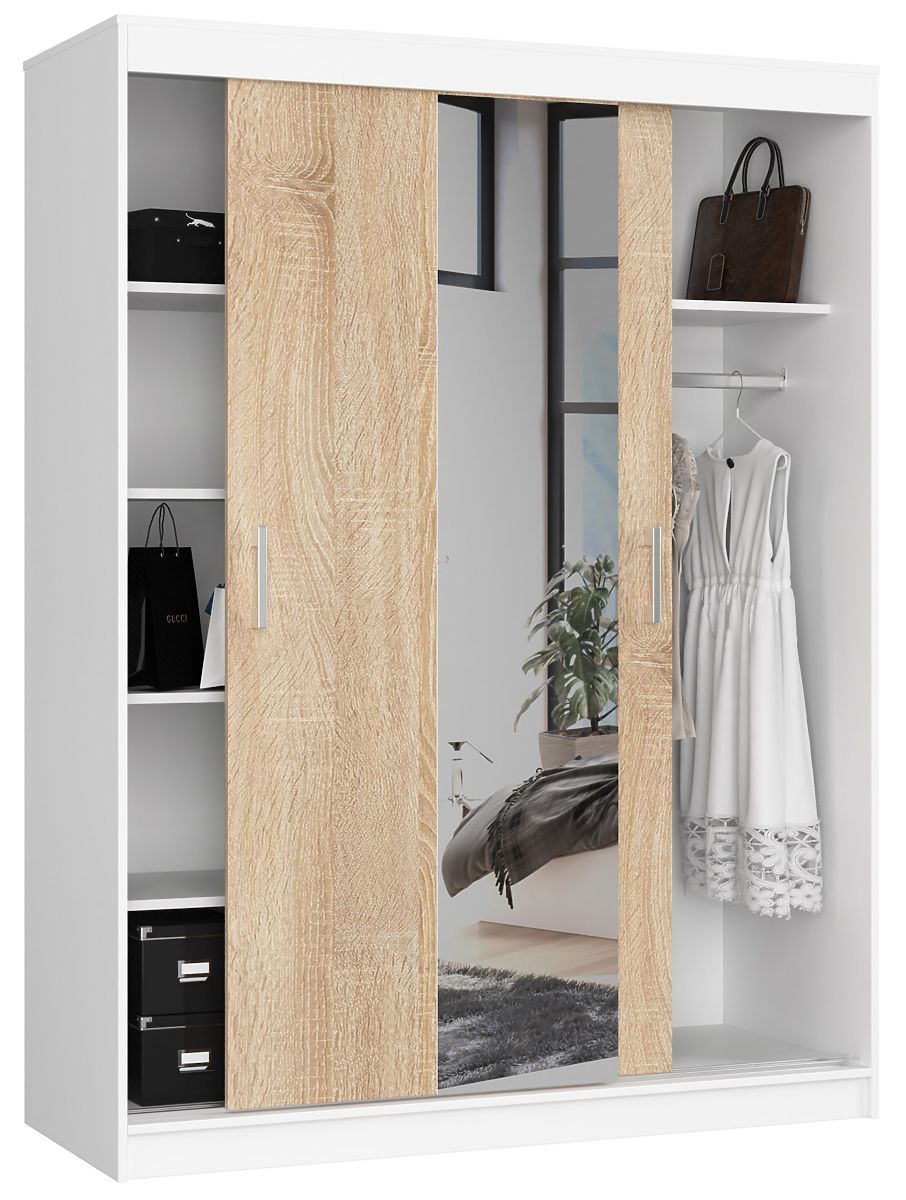 Drsna bela omara z vrati v dekorju hrast sonoma dolžine 150 cm s policami in drogom za oblačila. Velika površina za uporabo.