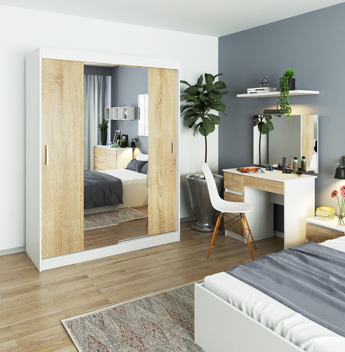 Drsna omara 150 cm CLP v odtenku sonoma nam omogoča zagotoviti potreben prostor v naši spalnici ali garderobi, ki ga lahko uporabimo za shranjevanje različnih stvari, ne le oblačil, ampak tudi na primer rezervnih prevlek za blazine. Kako bomo ta kos pohištva uporabili, je odvisno od naših individualnih potreb. Omara je opremljena z zelo praktičnim in uporabnim elementom v obliki ogledala, ki nam omogoča preveriti, ali je izbrani stil pravi. Pohištvo lahko uspešno postavimo tudi v predsobo, dnevno sobo ali študentsko sobo. Prostor, ki ga imamo na voljo pri tem izdelku, je dovolj za dve osebi.