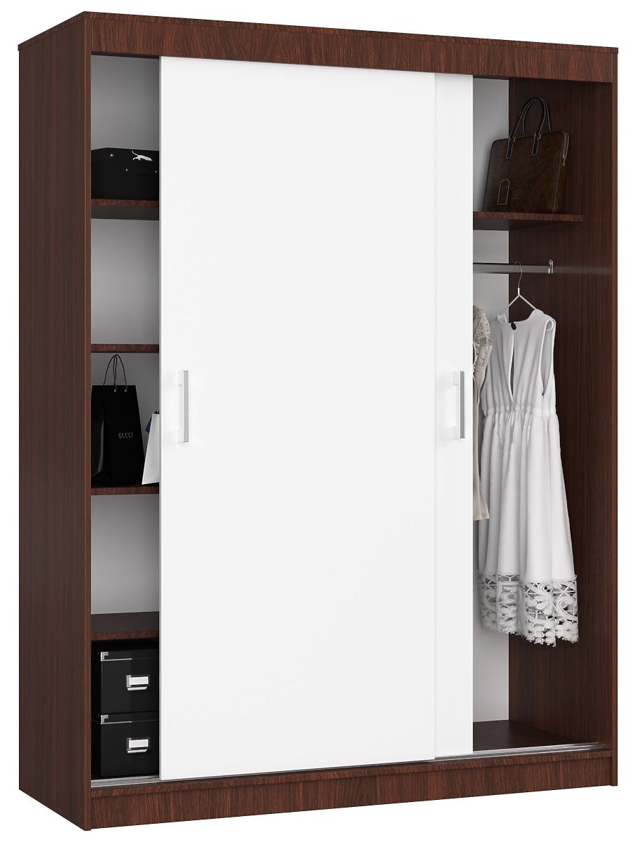Kakšne omare so priljubljene? Tiste, ki so prostorne in funkcionalne ter hkrati estetsko oblikovane. Te pogoje izpolnjuje drsna omara 150 cm CLP v barvi wenge in beli iz naše ponudbe. Namenjena je za dve osebi. Odlično se prilega spalnici, dnevni sobi ali garderobi. V njej lahko shranjujete ne le oblačila, ampak tudi tekstil. To je prostoren kos pohištva, ki pomaga ohranjati red v sobi.