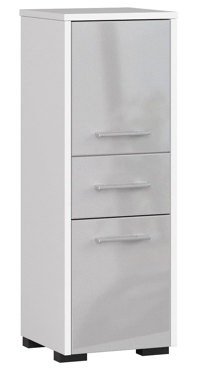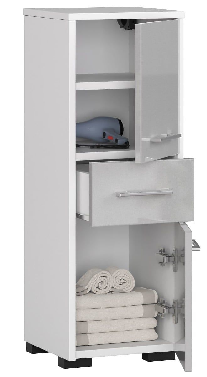 Kopalniški stolp FIN z enim predalom in dvema nagibnima vratoma je izdelan iz visokokakovostne, proti obrabi odporne laminirane pohištvene plošče Kronospan. Bel korpus pohištva se odlično ujema s sprednjimi stranmi z akrilno površino v visokem sijaju v kovinski barvi. Pod ploščo stolpa je omarica z dvema policama in vrati. Spodaj je predal, pod njim pa še ena omarica – tokrat z eno polico. Elegantno kopalniško omarico dopolnjujejo zanimivi, udobni in preprosti ročaji.
