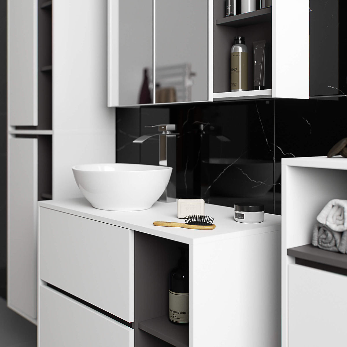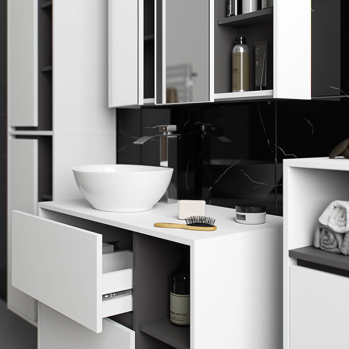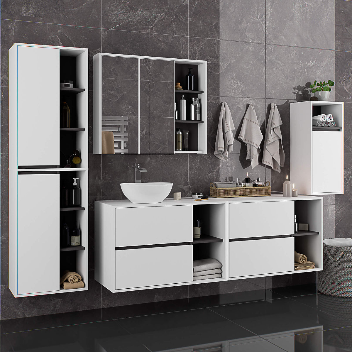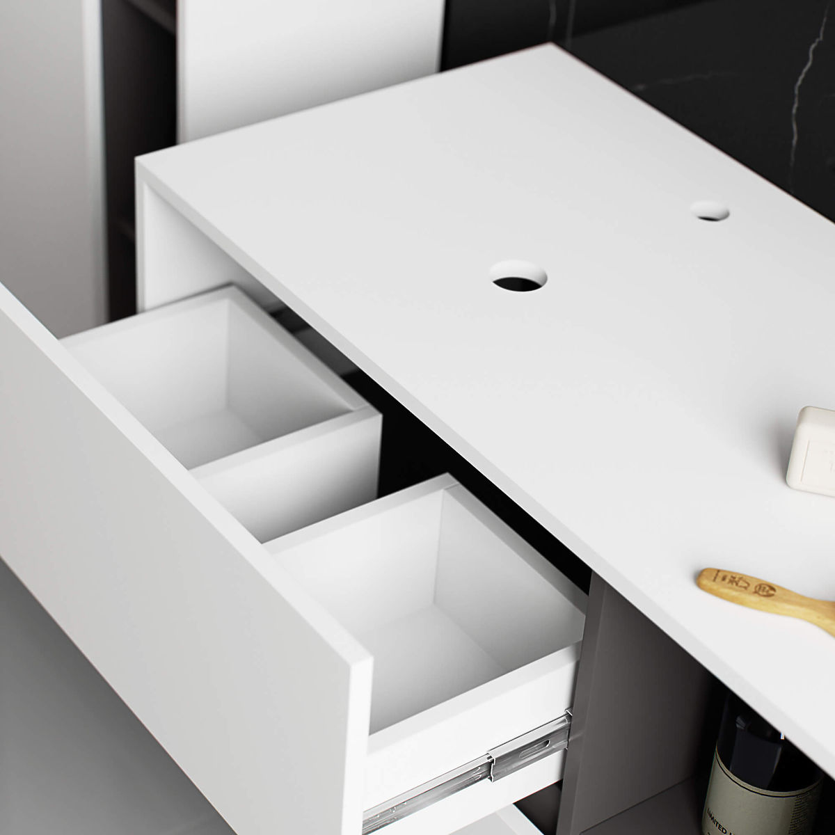 Viseča omarica za kopalnico pod umivalnik 90 cm VAMI W90 se popolnoma ujema z modernim interierjem. Konfiguracija z 2 predaloma in 2 odprtima policama ponuja veliko udobje pri uporabi. V prostorne predale lahko shranite higienske in kozmetične izdelke, na odprte police pa postavite dekoracije, ki interierju dodajo osebni značaj. Opisani model viseče omarice pod umivalnik ima v plošči 2 odprtini, namenjeni za montažo umivalnika in sifona. Omarica ima tudi posebej oblikovane predale, ki omogočajo namestitev sifona in hidravličnih elementov. POZOR! Pohištvo se dostavlja brez umivalnika in armature.
