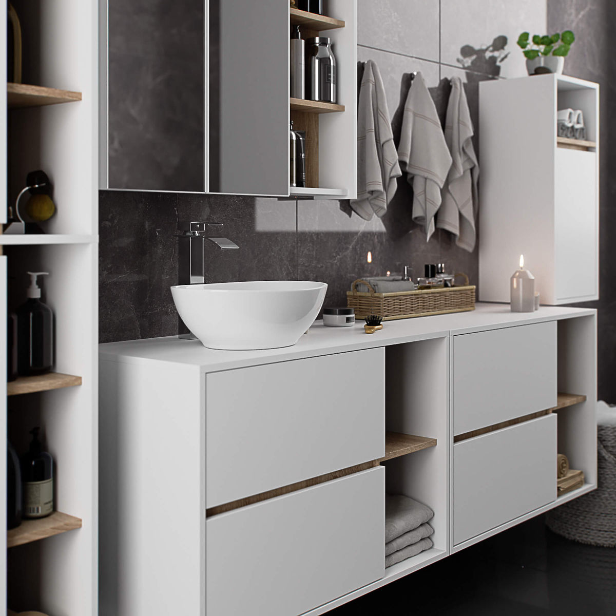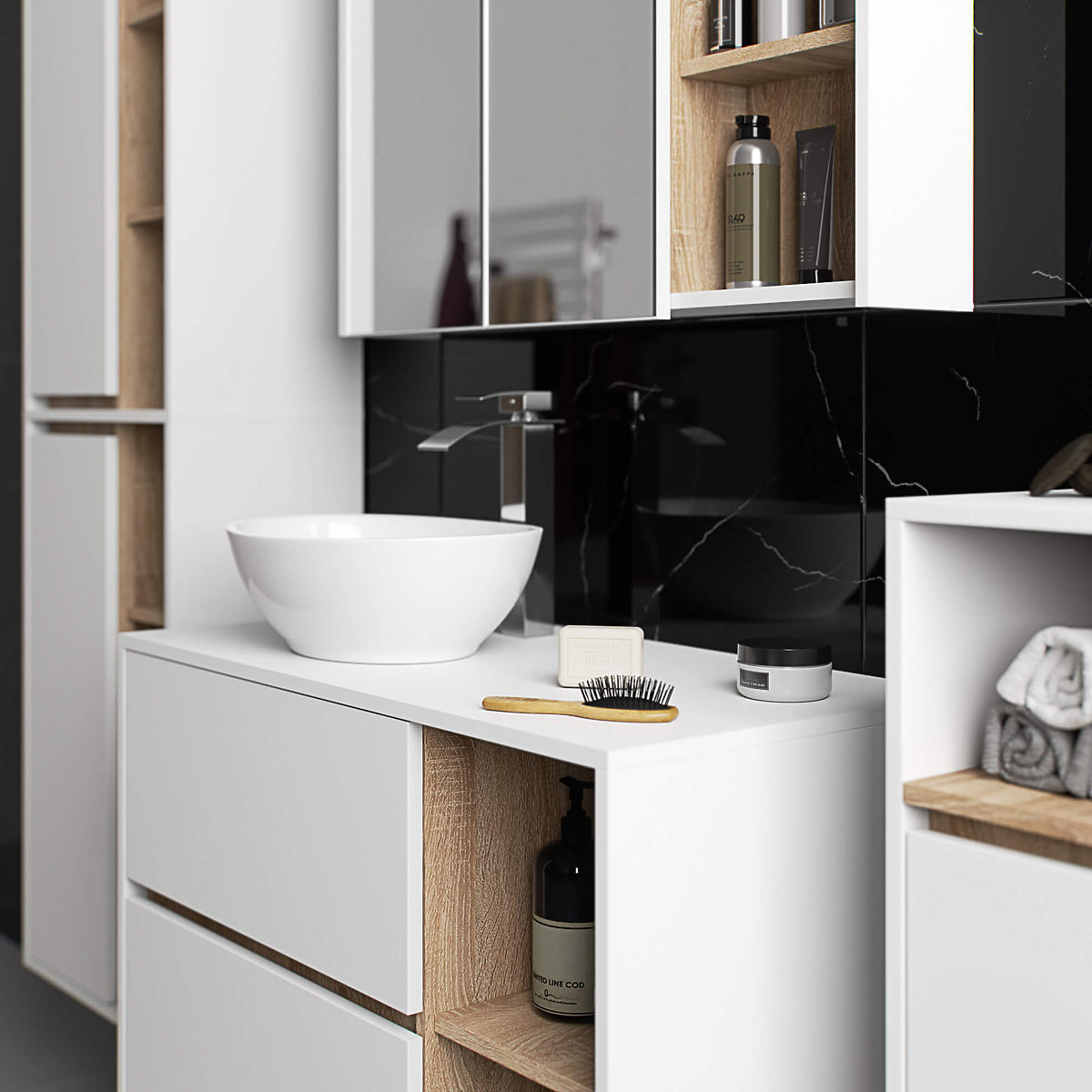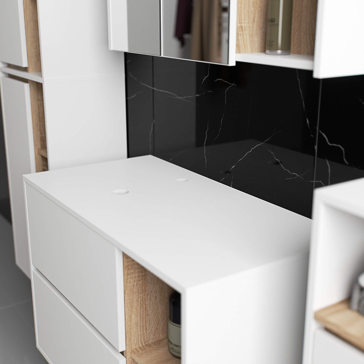 Stenska omarica za kopalnico pod umivalnik 90 cm VAMI W90 se popolnoma prilega sodobnemu interierju. Konfiguracija z 2 predaloma in 2 odprtima policama ponuja veliko udobje pri uporabi. V prostorne predale lahko shranite higienske in kozmetične izdelke, medtem ko na odprtih policah lahko postavite npr. dekoracije, ki interierju dodajo osebni značaj. Ta model stenske omarice pod umivalnik ima v plošči 2 odprtini, namenjeni za montažo umivalnika in sifona. Omarica ima tudi posebej oblikovane predale, ki omogočajo namestitev sifona in hidravličnih elementov. POZOR! Pohištvo je dobavljeno brez umivalnika in armature.
