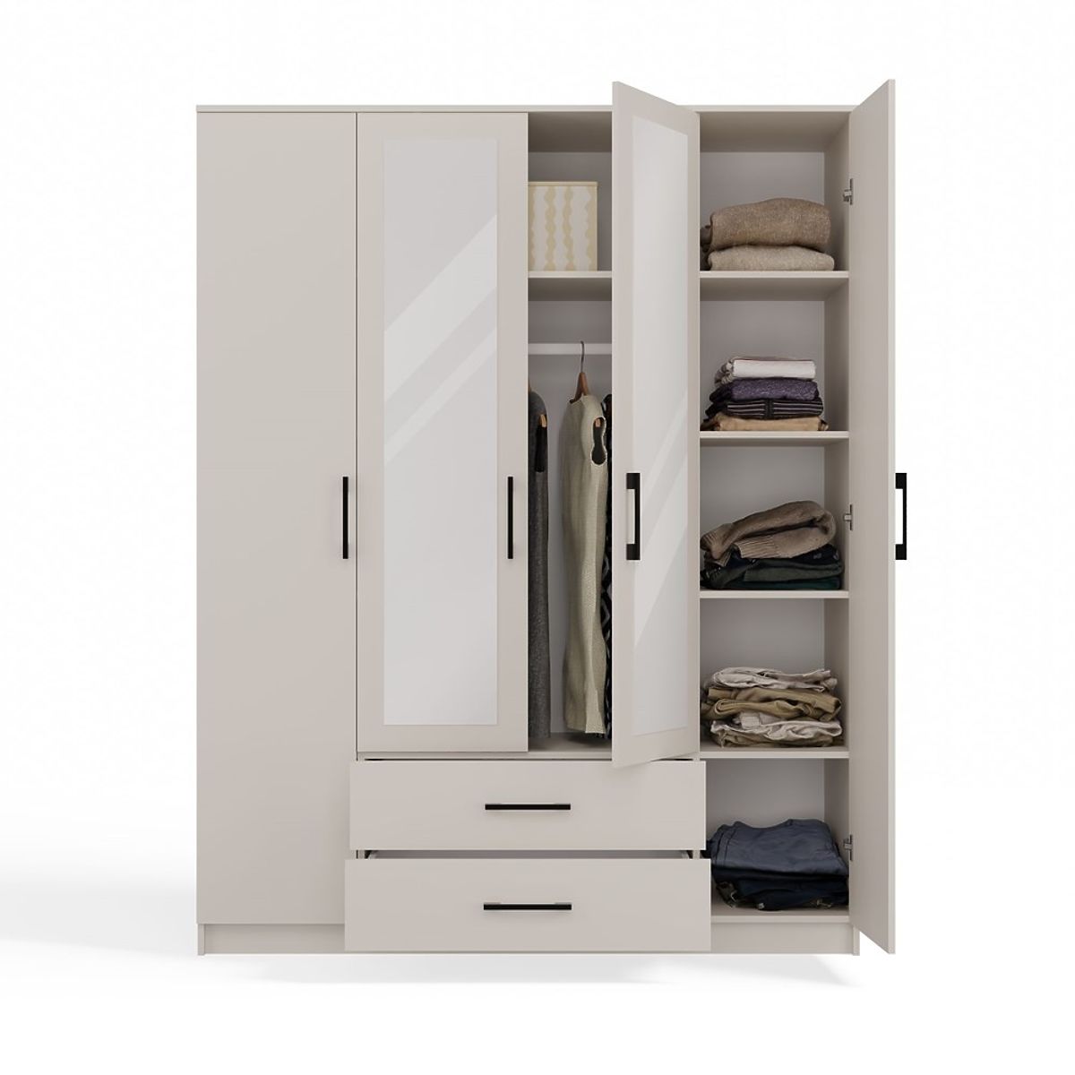 - Velika kapaciteta: Prostorna notranja razporeditev s policami in drogom za oblačila zagotavlja, da je omara idealna za shranjevanje tako obešenih kot zloženih oblačil. Dva predala omogočata udobno shranjevanje spodnjega perila ali dodatkov.