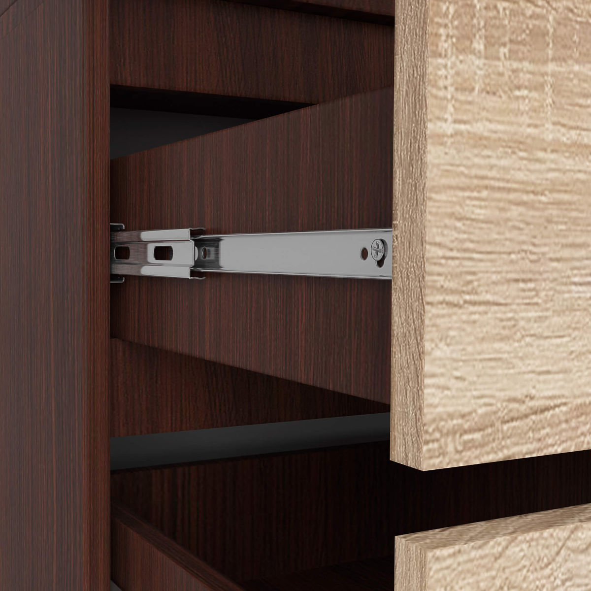 Predstavljene omare združujejo funkcionalnost in sodoben dizajn. Izdelane so iz visokokakovostnih laminiranih plošč, ki izkazujejo povečano odpornost proti obrabi in drugim mehanskim poškodbam. Robovi omar, kot element, ki je najbolj izpostavljen poškodbam, so dodatno ojačani z uporabo ABS robov. Tako pohištvo ohranja idealen videz skozi celotno obdobje uporabe. Kombinacija dveh barvnih motivov - temnega, globokega wengeja in svetle, hladne sonome - ustvarja zelo izviren in sodoben dizajn.