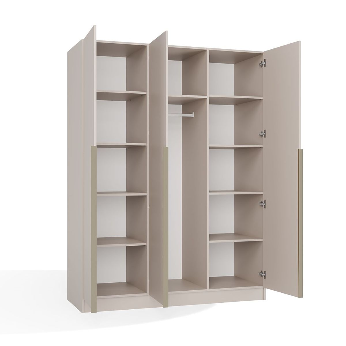 Če iščete kombinacijo minimalizma, elegance in izjemne funkcionalnosti, je omara SENSO 3D prava izbira za vas. Ta tridelna omara navdušuje s preprosto obliko, mat površino v barvi kašmirja in značilnimi zlatimi ročaji v odtenku brušenega zlata, ki poudarjajo njen luksuzni značaj.