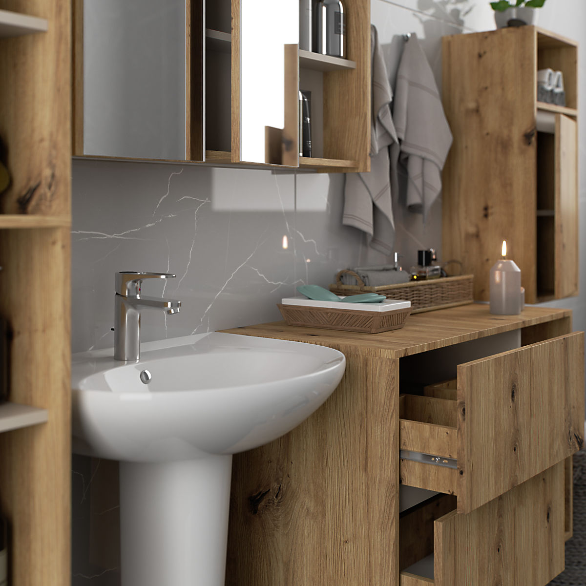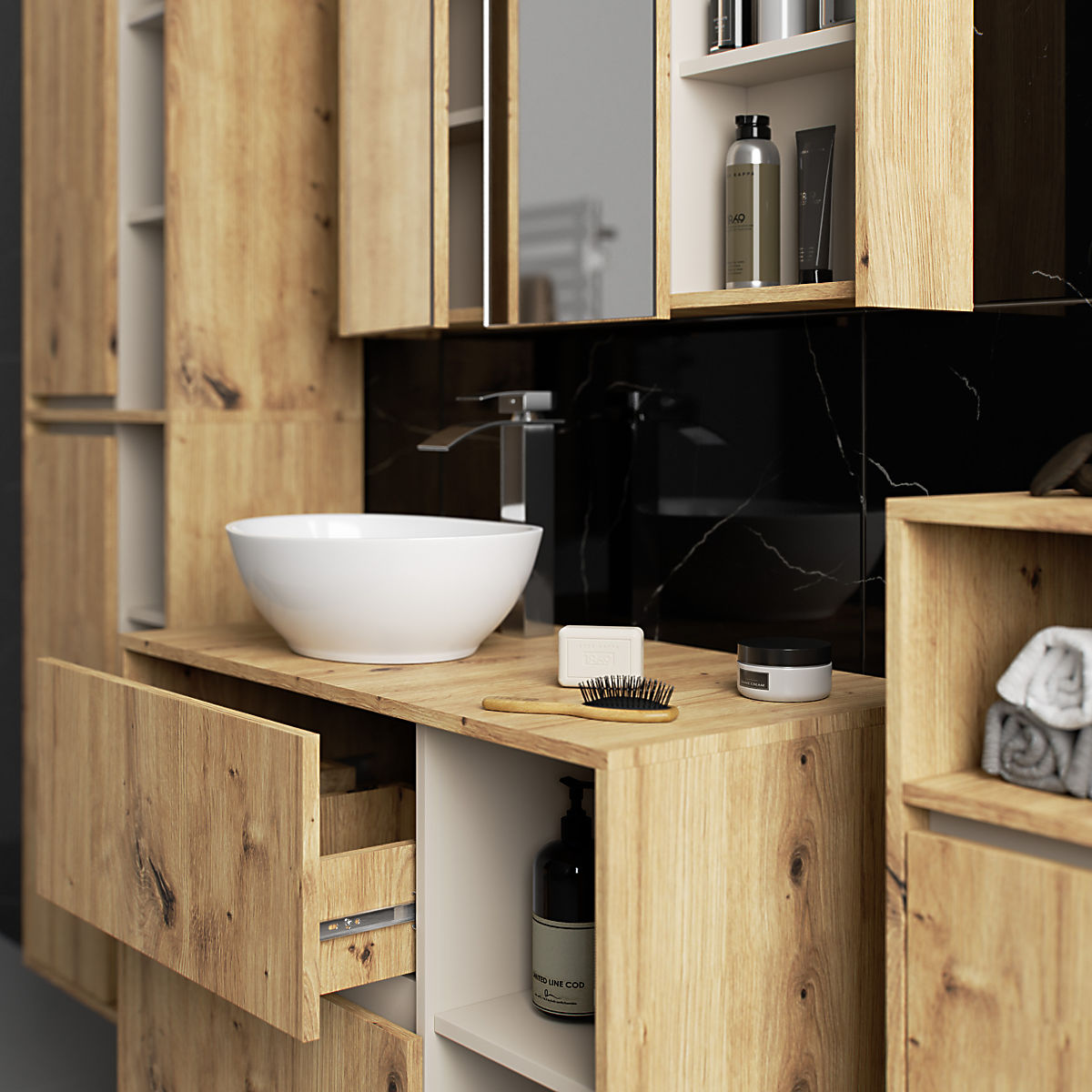 Kopalniške omarice odlično dopolnjujejo opremo kopalnice, zagotavljajo potreben prostor za vso kozmetiko in detergente ter dodajo kopalnici določen stil. Prostorne omarice olajšajo vzdrževanje reda v prostoru, kar ugodno vpliva na estetiko notranjosti. Kolekcija VAMI se odlikuje z privlačno stilno barvno shemo – korpus in čela imajo enako barvo, medtem ko je notranja barva drugačna.